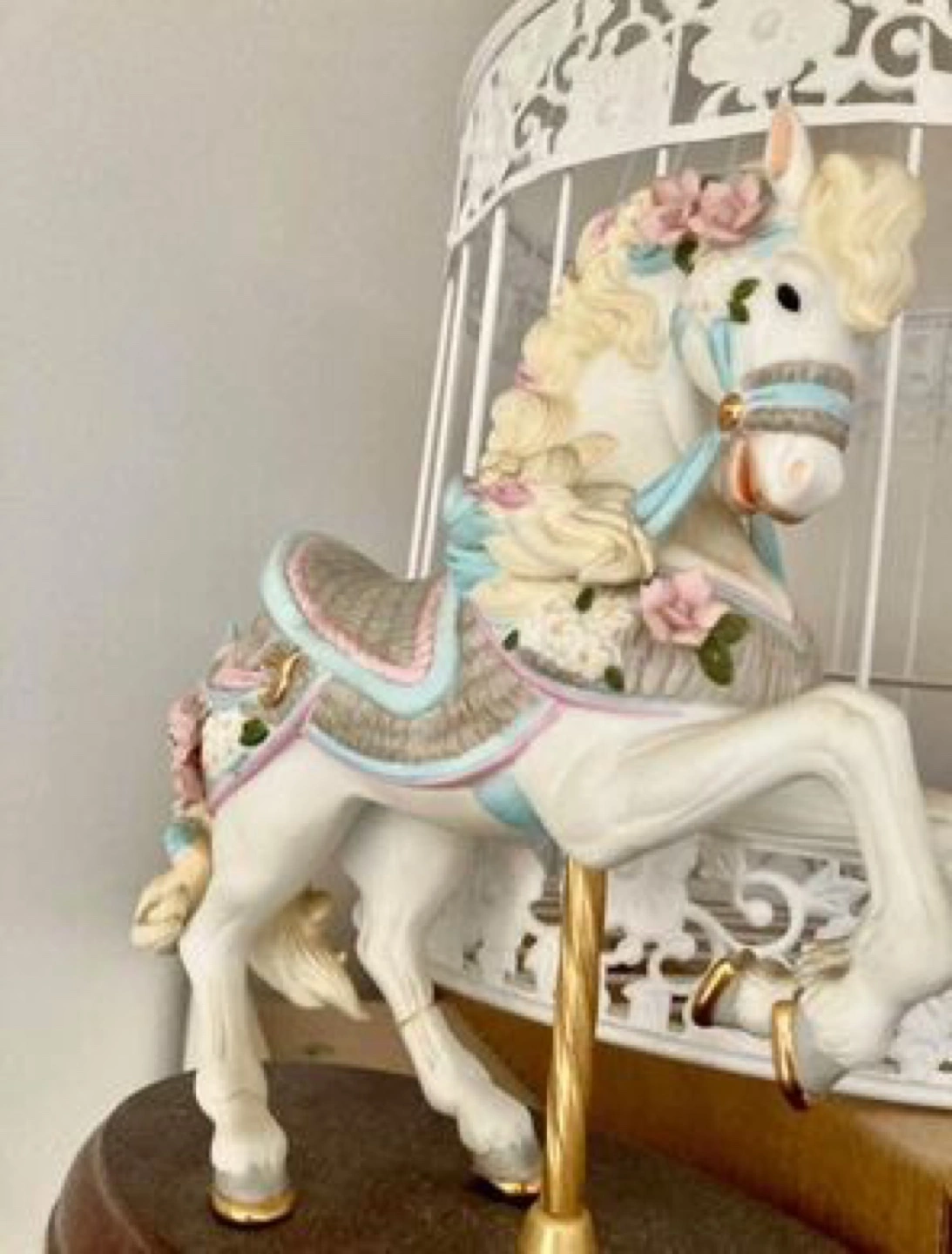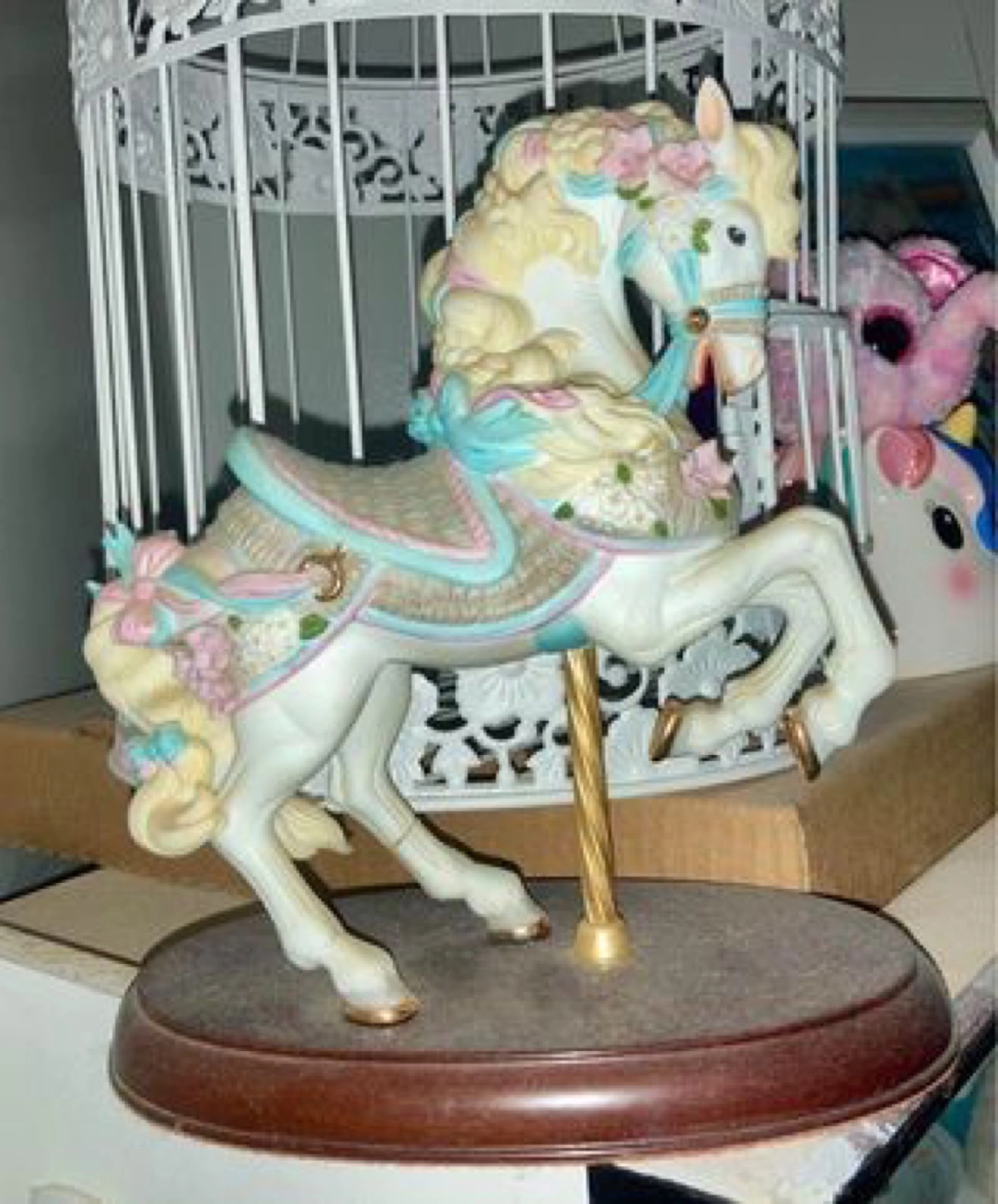 White porcelain carousel horse figurine with pastel blue and pink accents. Features a floral design. Stands on a wooden base with a gold pole. Pretty carrousel horse, standing 8 inches high with real gold trim. I don’t remember how many karats it is . Leg broke & was re-glued, and back ear broke off, but not noticeable from the front . I will dust base , my bad lol . This was a very expensive collectable when I bought it, but my daughter did the damage to it . From a smoke free home . Pickup In Woodstock . No delivery no shipping. No holds first come first served. Cash only