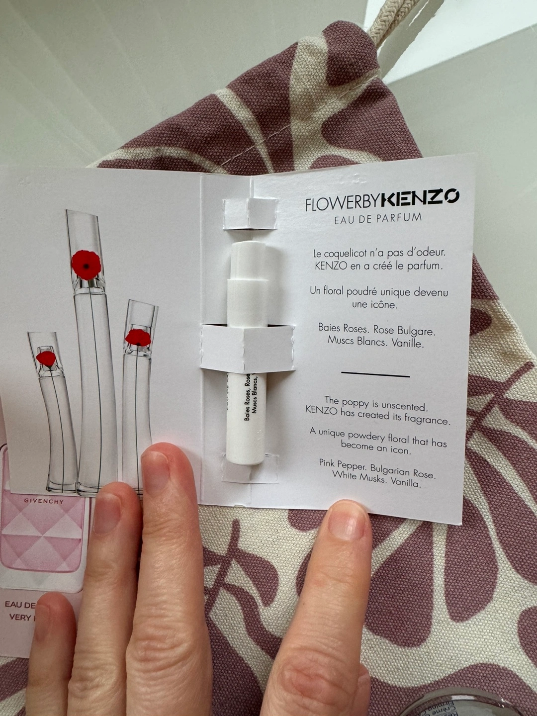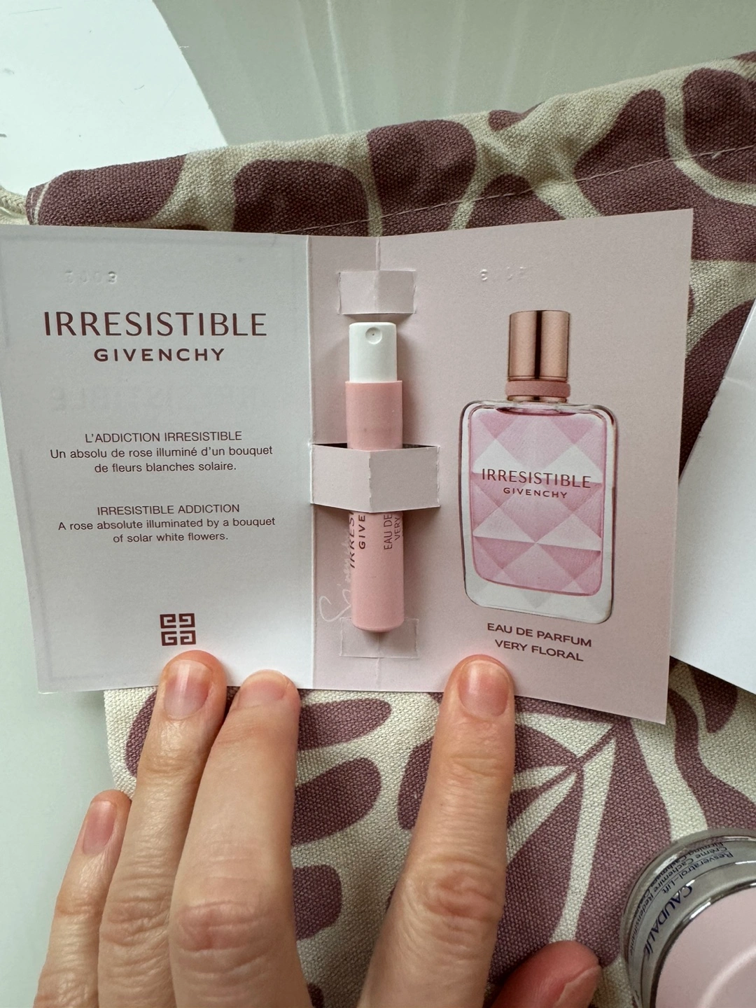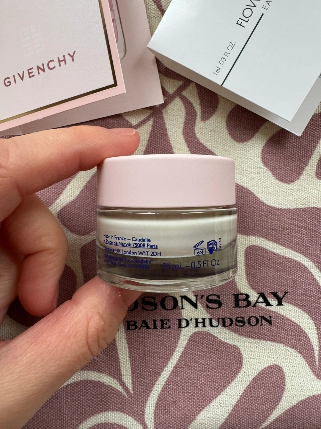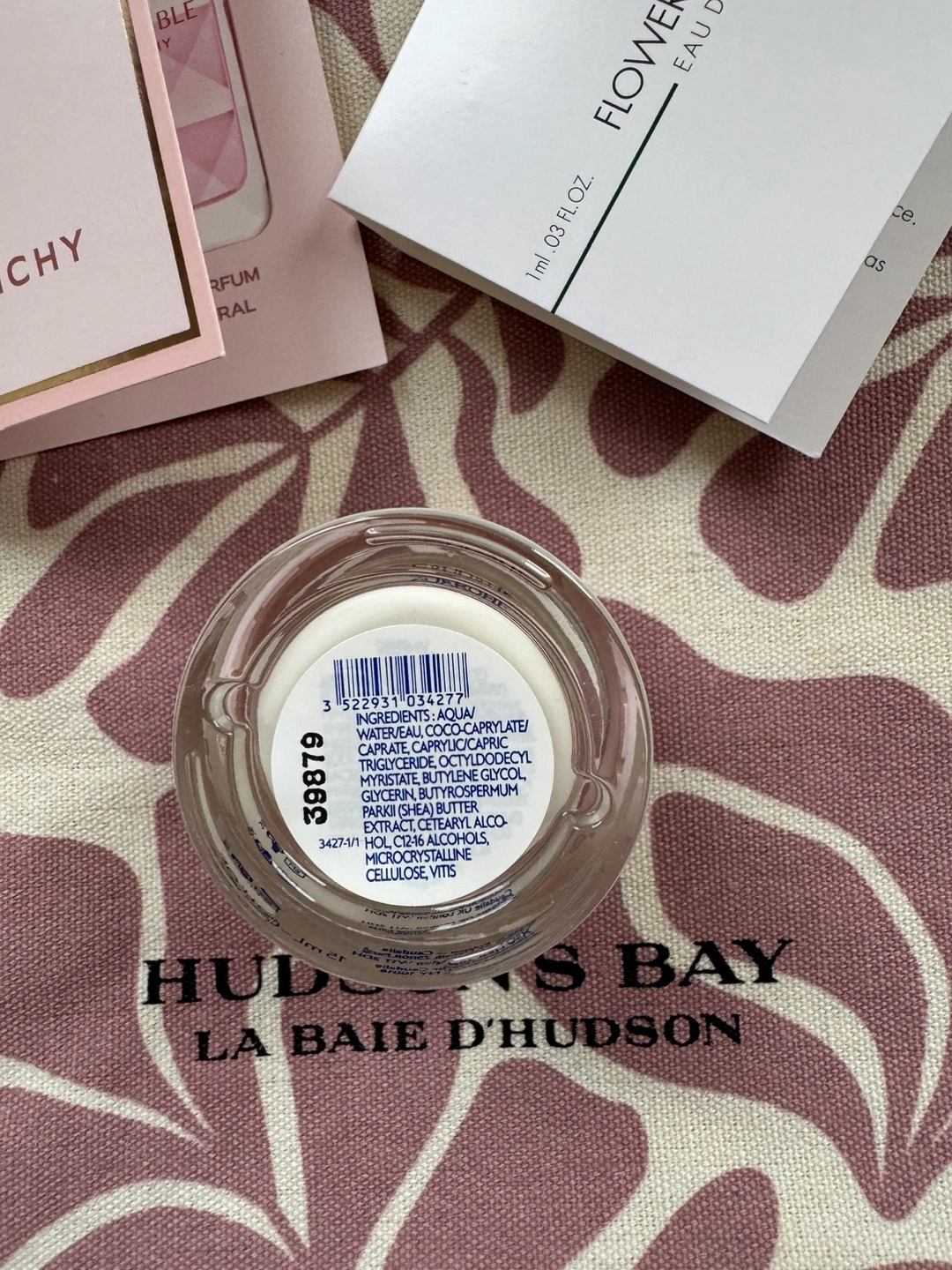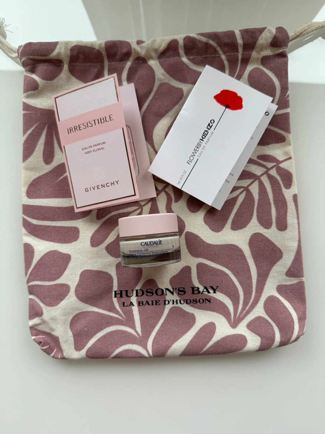 15 ml Caudalie Firming Cashmere Cream (Resveratrol Lift) Two Eau de Parfum samples: 1) Givenchy Irresistible 2) Flower by Kenzo Hudson Bay drawstring pouch.