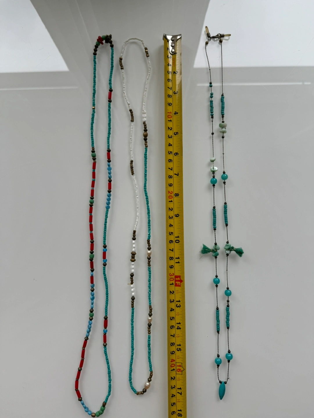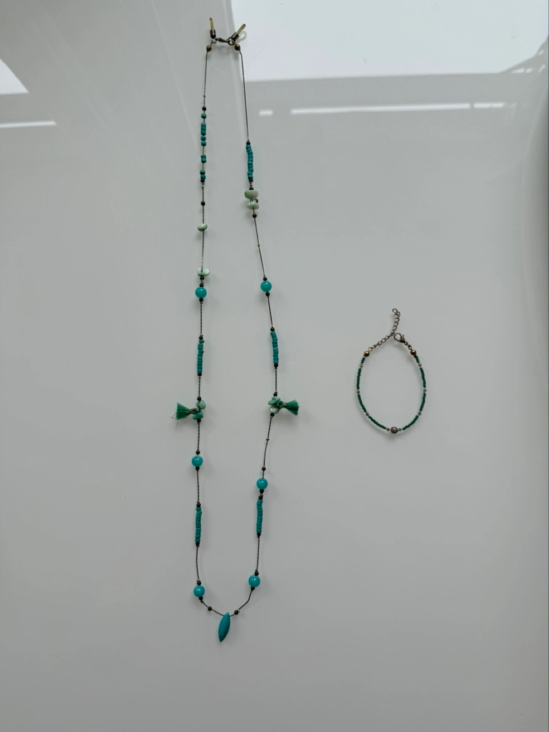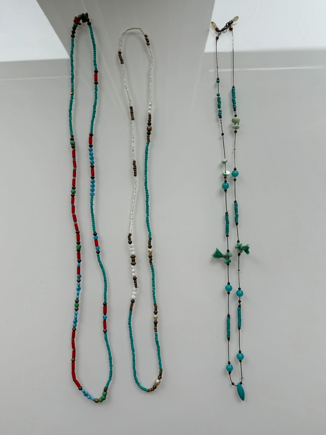 Various fashion jewelry. Purchased throughout different travels. The green bracelet is from Mykonos along with the glasses chain. The two turquoise long necklaces were purchase in Kenya and are handmade by locals in the Masai Mara region.