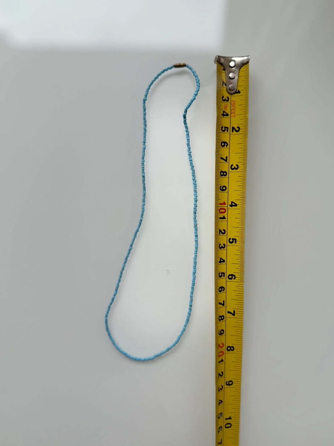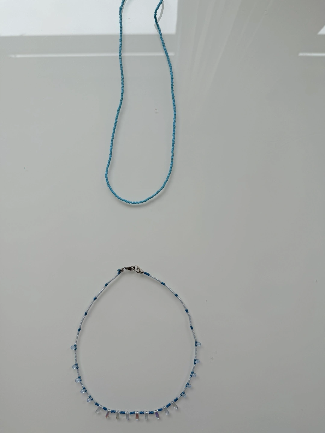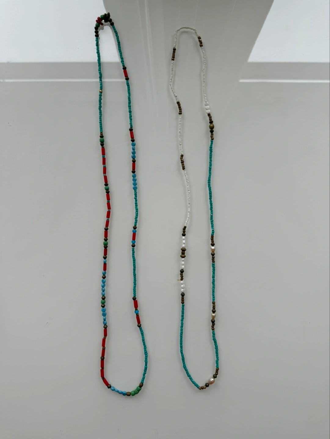Various fashion jewelry. Purchased throughout different travels. The green bracelet is from Mykonos along with the glasses chain. The two turquoise long necklaces were purchase in Kenya and are handmade by locals in the Masai Mara region.