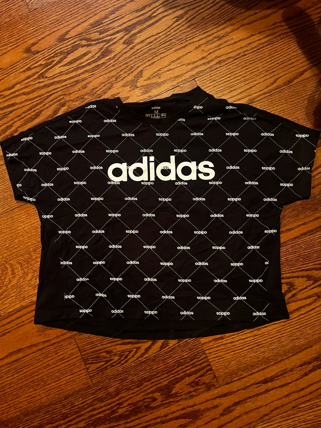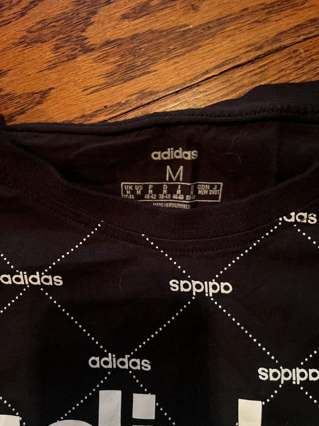 Black t-shirt with white Adidas logo pattern. (prices are negotiable)