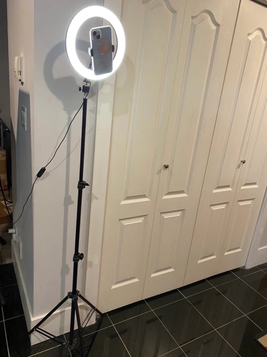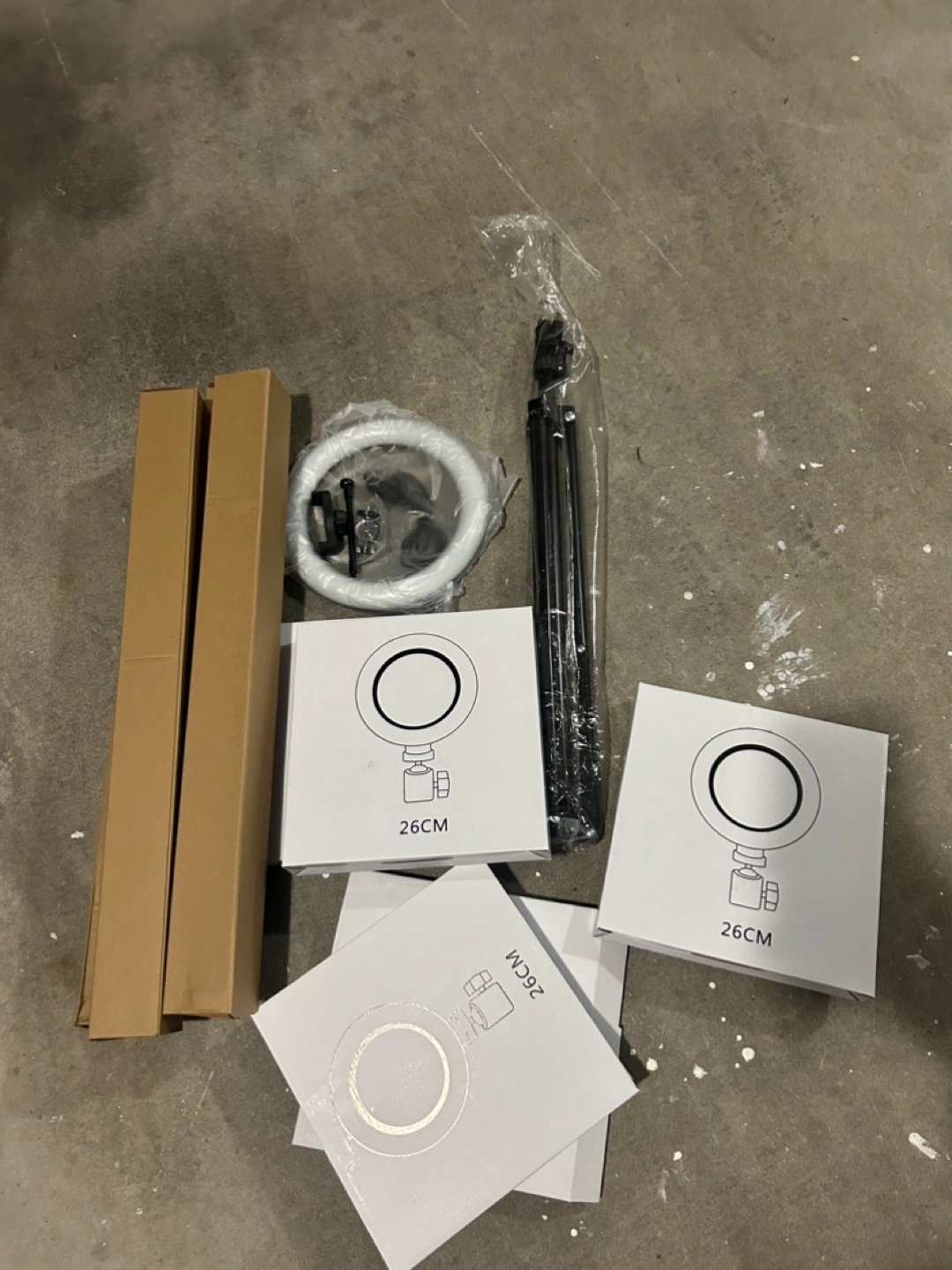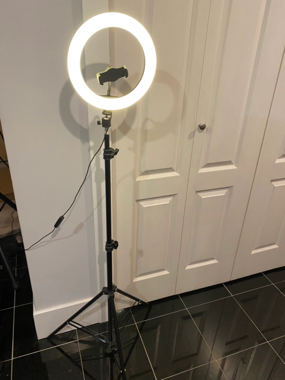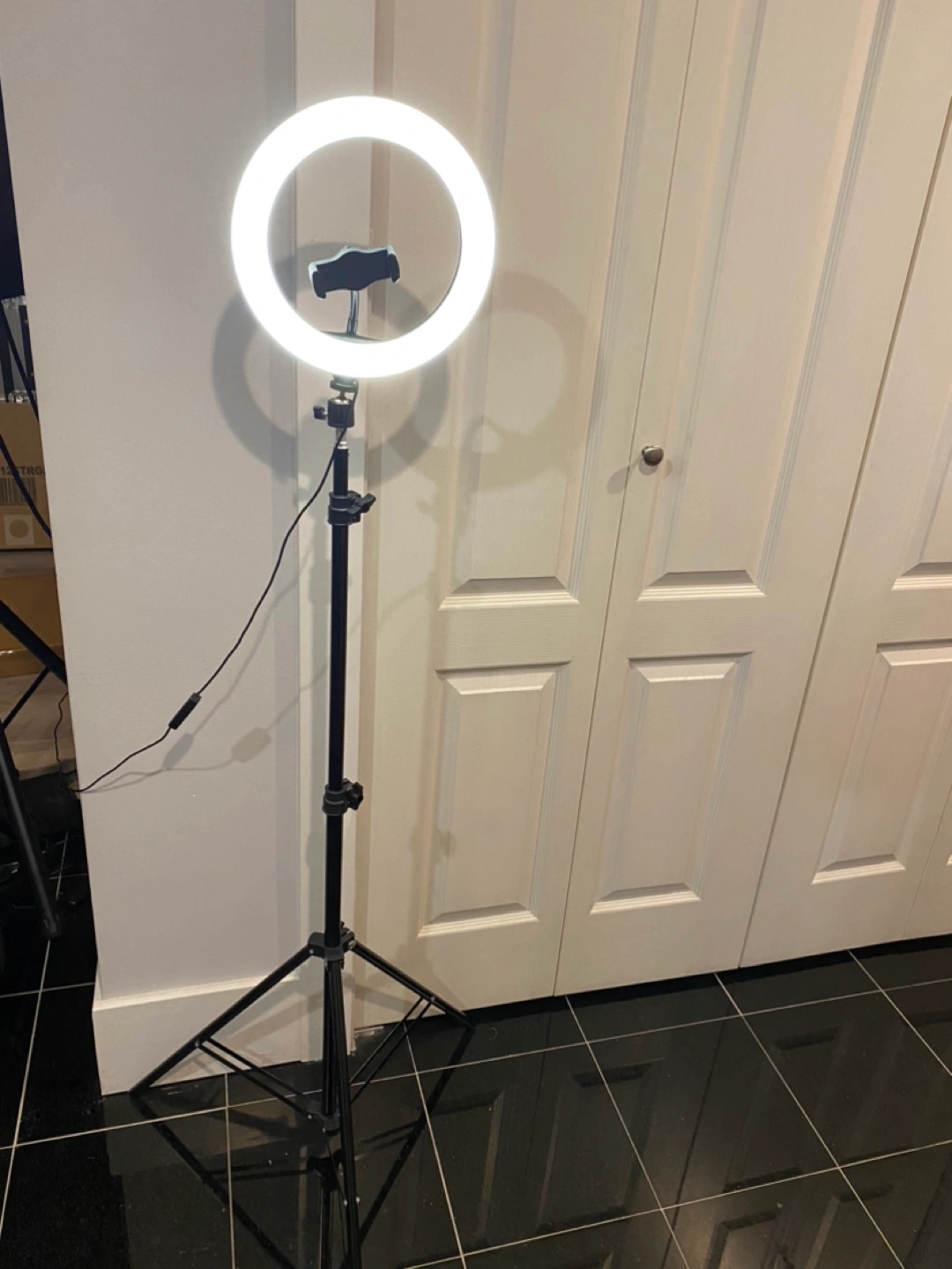 Ring light with adjustable brightness and colour temperature. Includes tripod stand. Phone holder included.