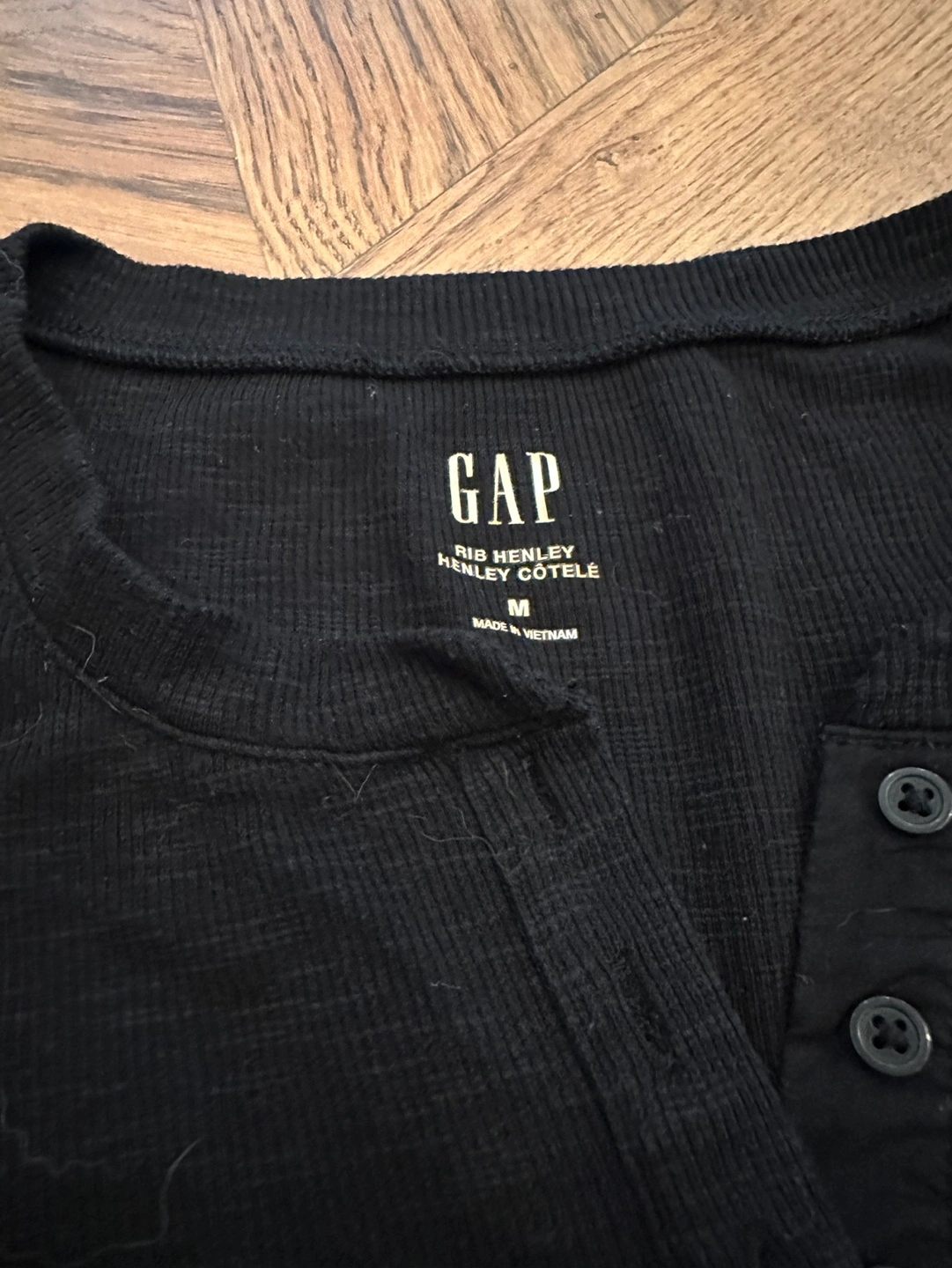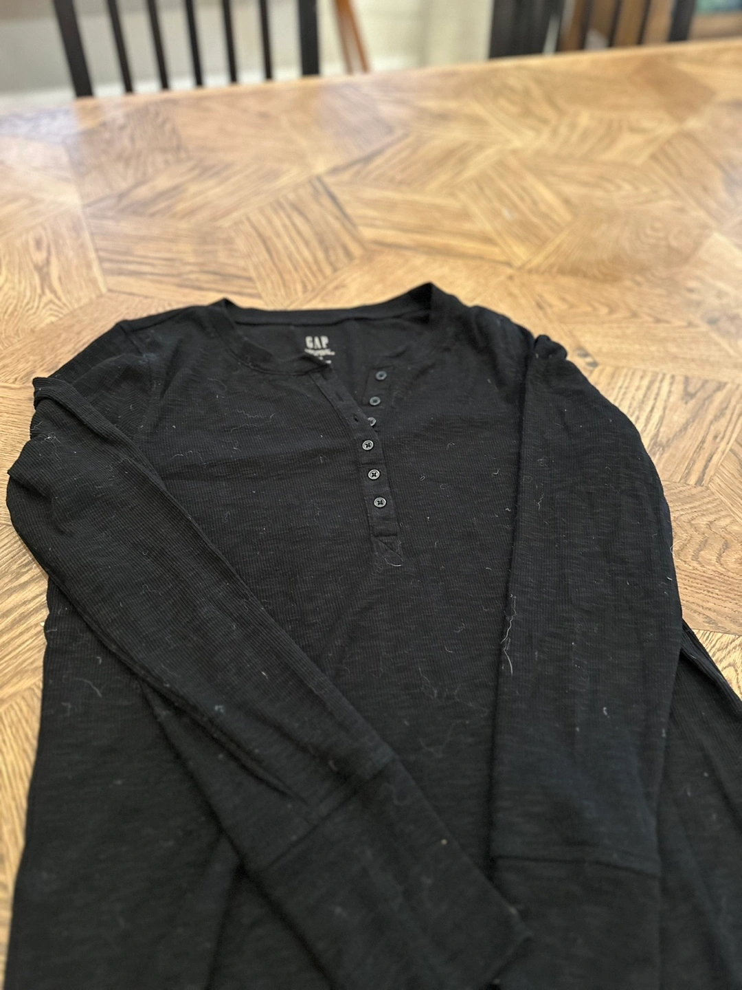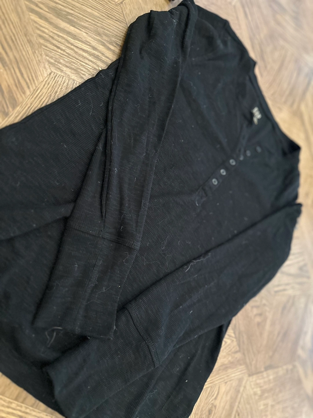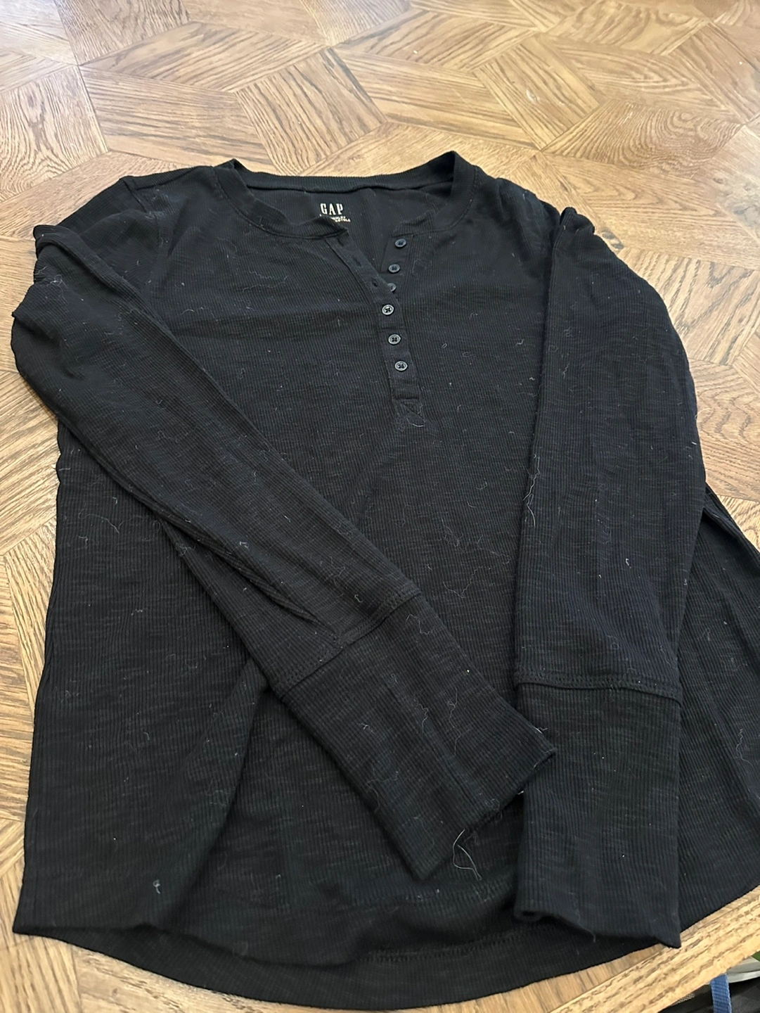 Black long sleeve Henley with button placket. Size M. Washed one time in cold and hung to dry. CASH ONLY please and thank you.