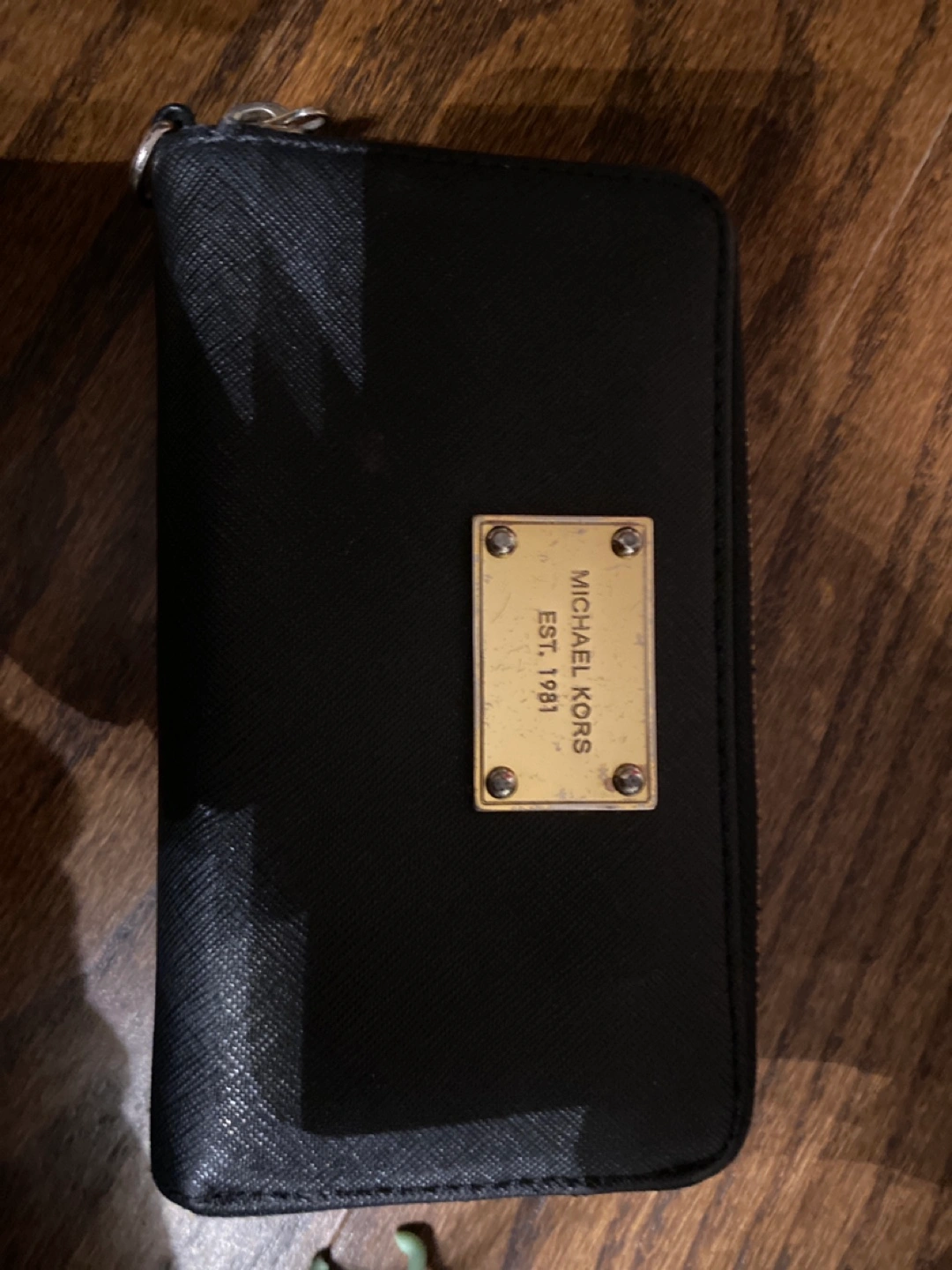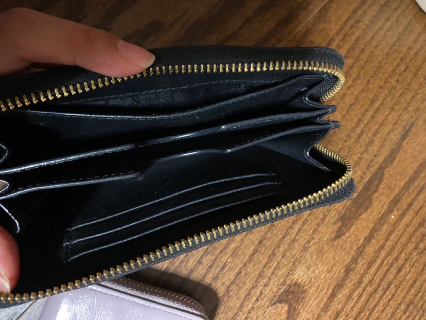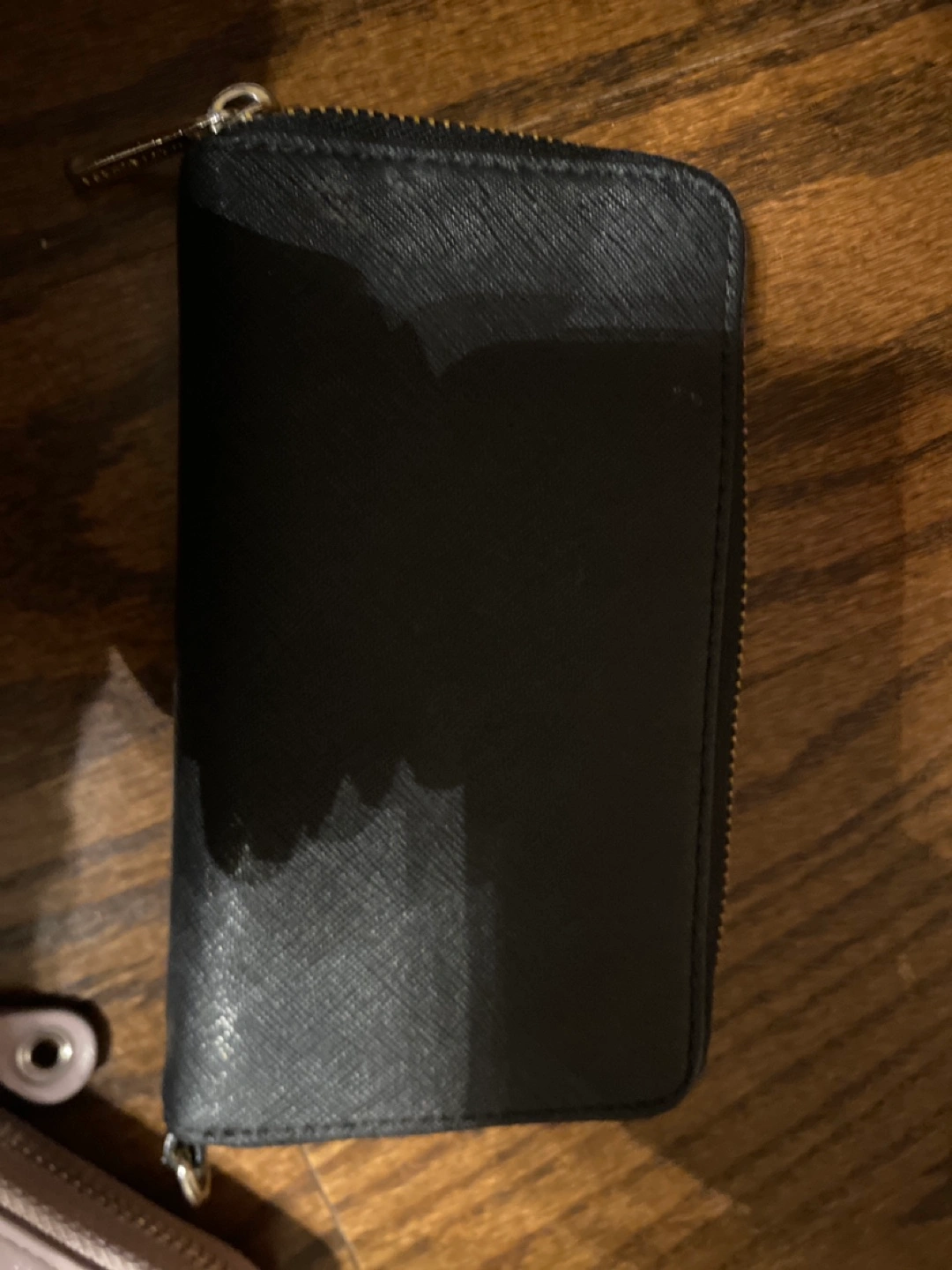 Black leather wallet with zipper closure. Has multiple card slots and a zippered coin pouch.