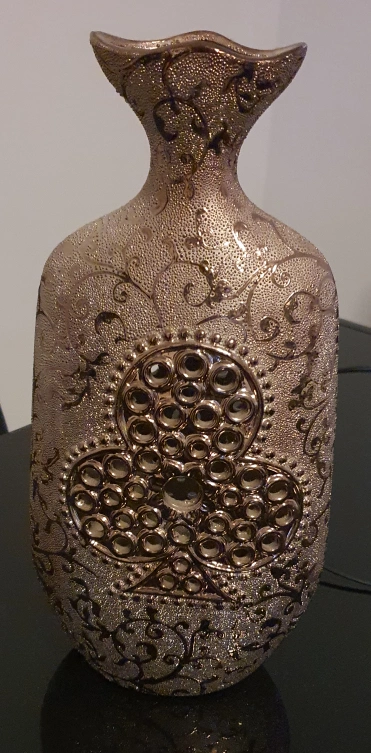 Gold and black decorative vase with intricate detailing. Features a unique design of a flower and a pattern of circles.