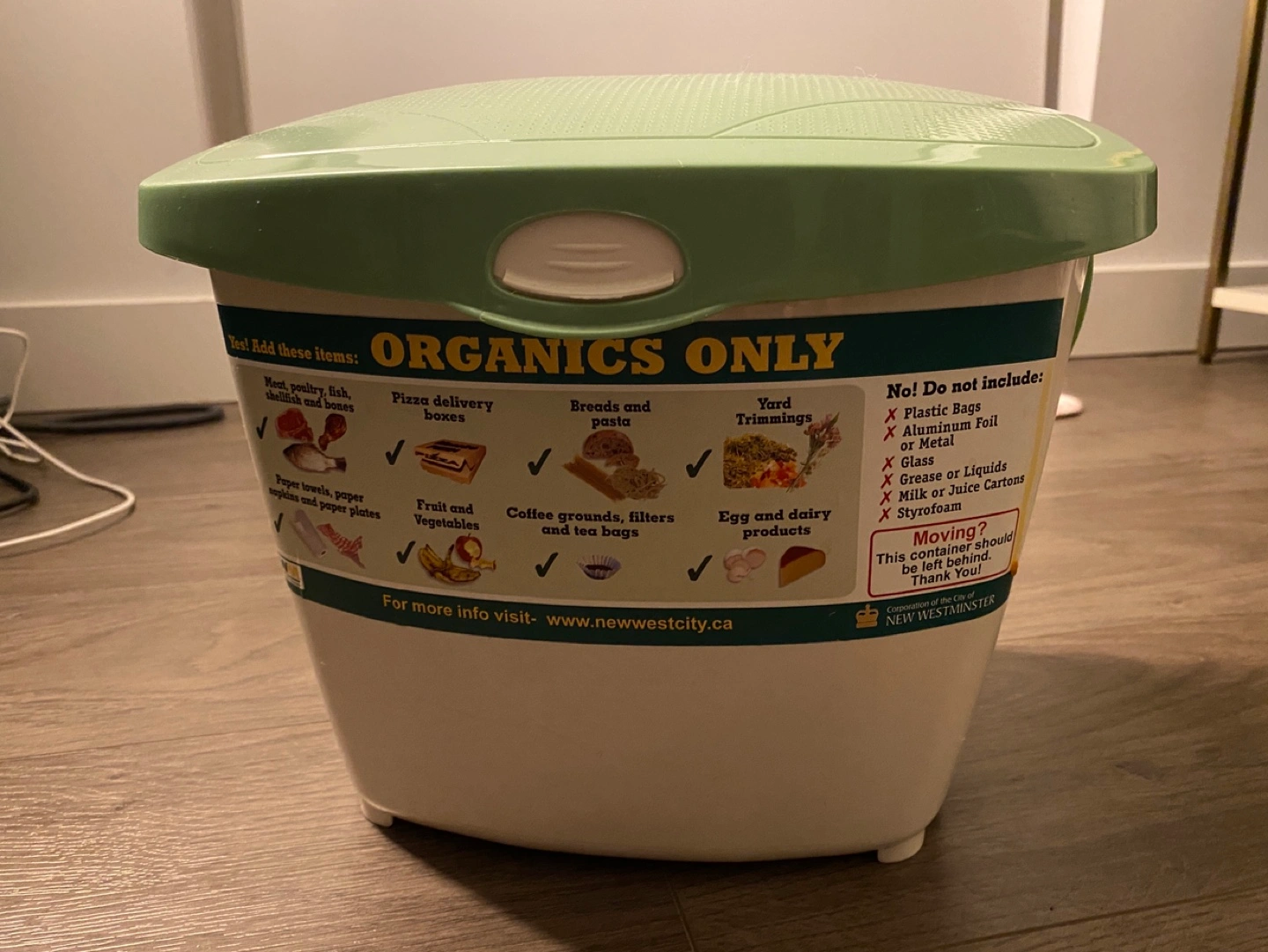 Compost bin with lid and handle. Green and white. Made of plastic.