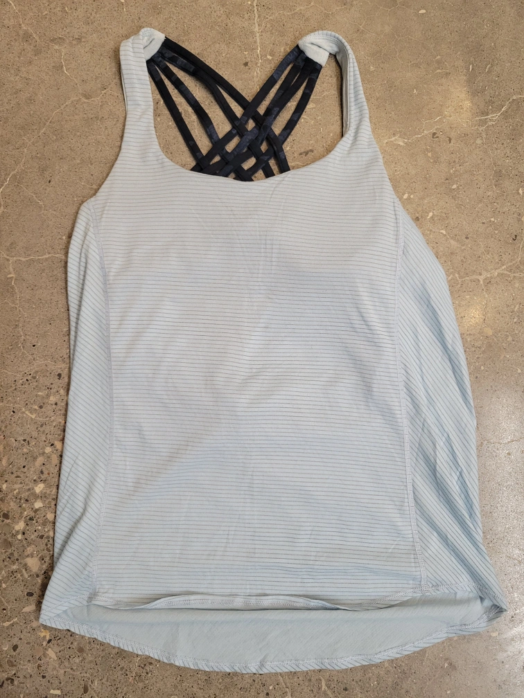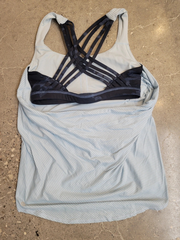 Blue tank top with a built-in bra and criss-cross straps in the back.