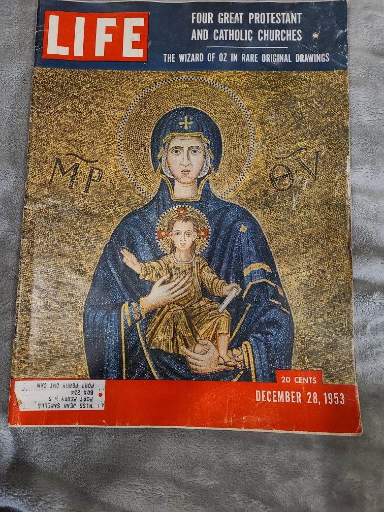 LIFE Magazine from December 28, 1953, featuring a mosaic of the Virgin Mary and baby Jesus. The issue also includes a feature on four great Protestant and Catholic churches and the Wizard of Oz in rare original drawings.