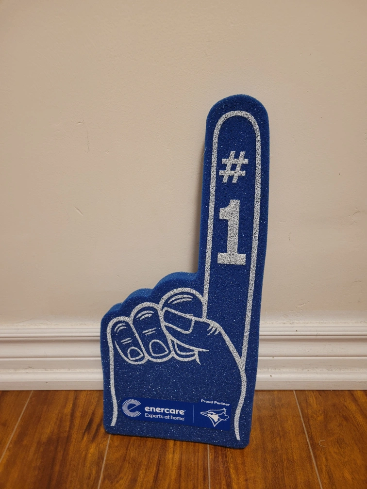 Foam finger with #1 on it. Blue with white glitter. Enerscare Experts at home logo, and Toronto Blue Jays logo.