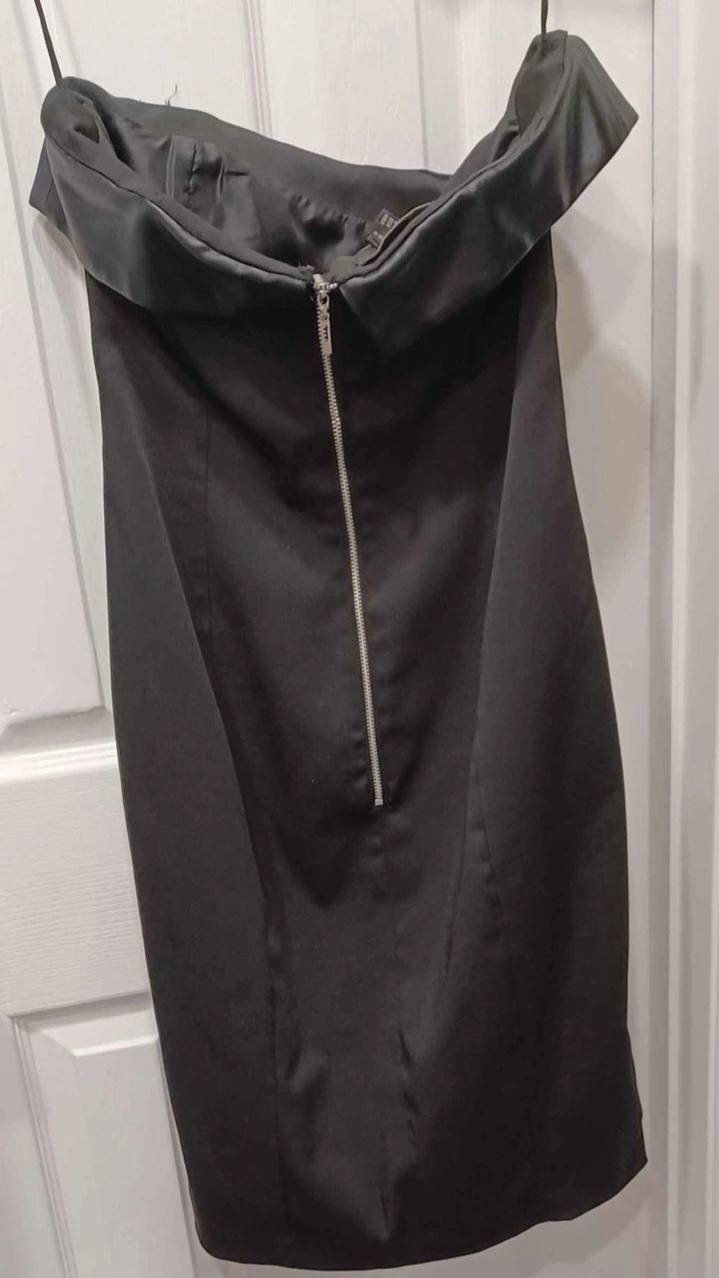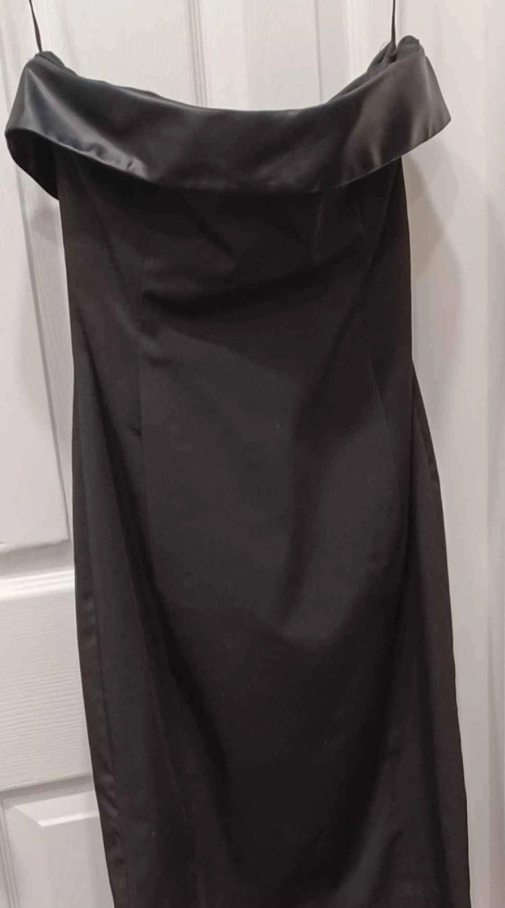 Black strapless dress with a satin band across the top. Back zipper closure. it's in excellent condition
