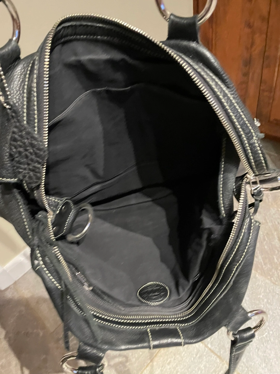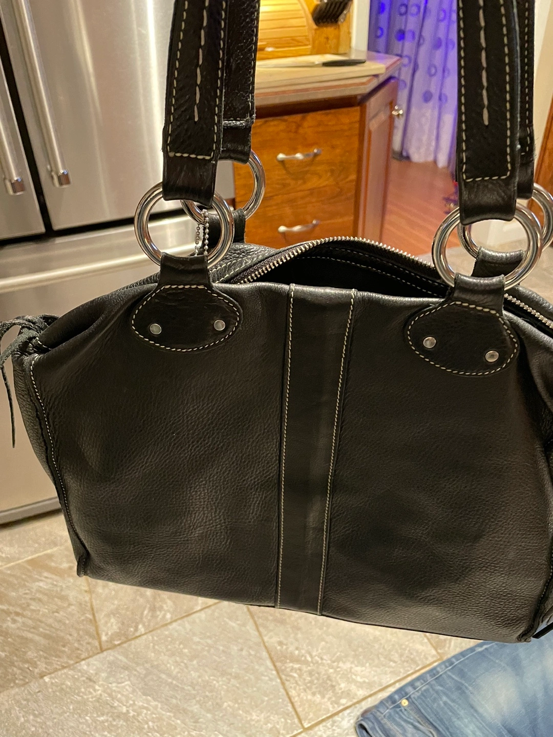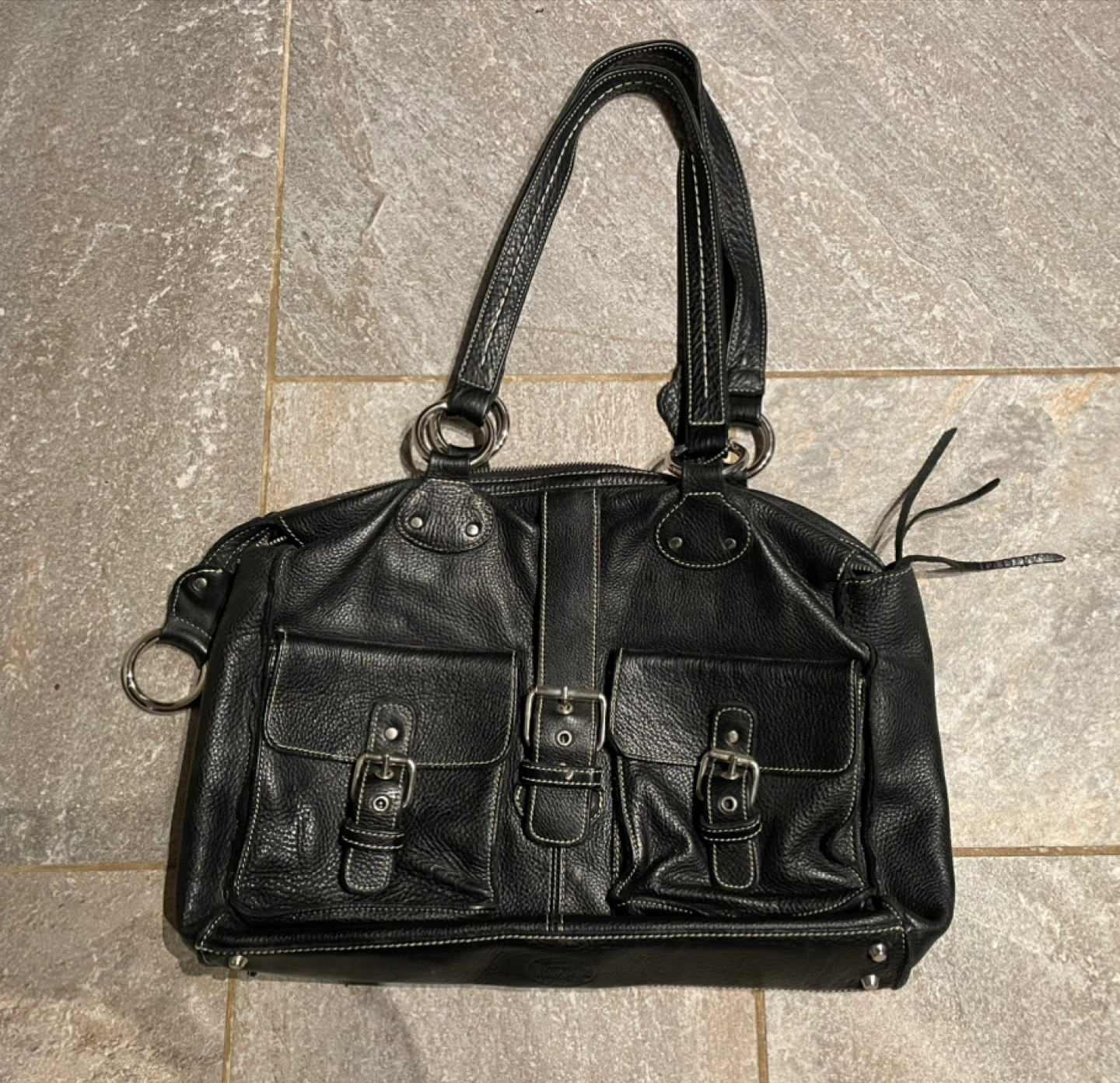Black leather handbag with silver hardware. Has a zipper closure and a spacious interior. Includes two pockets on the front and two on the back. Comes with a long strap.