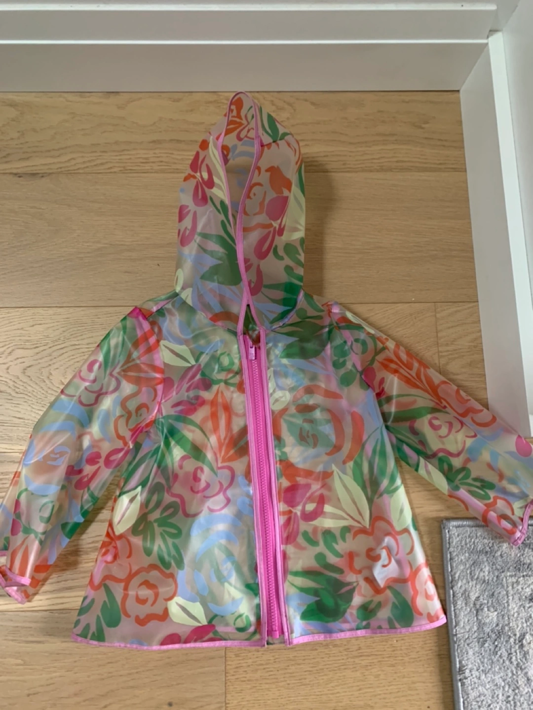 raincoat with pink trim and a hood. Floral print throughout. Zipper closure.