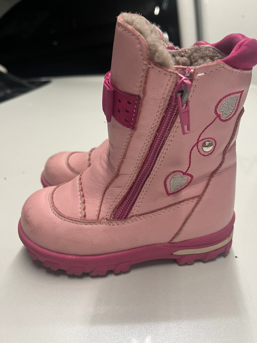 Pink leather boots with a zipper and velcro closure. Furry lining. Pet free, smoke free home