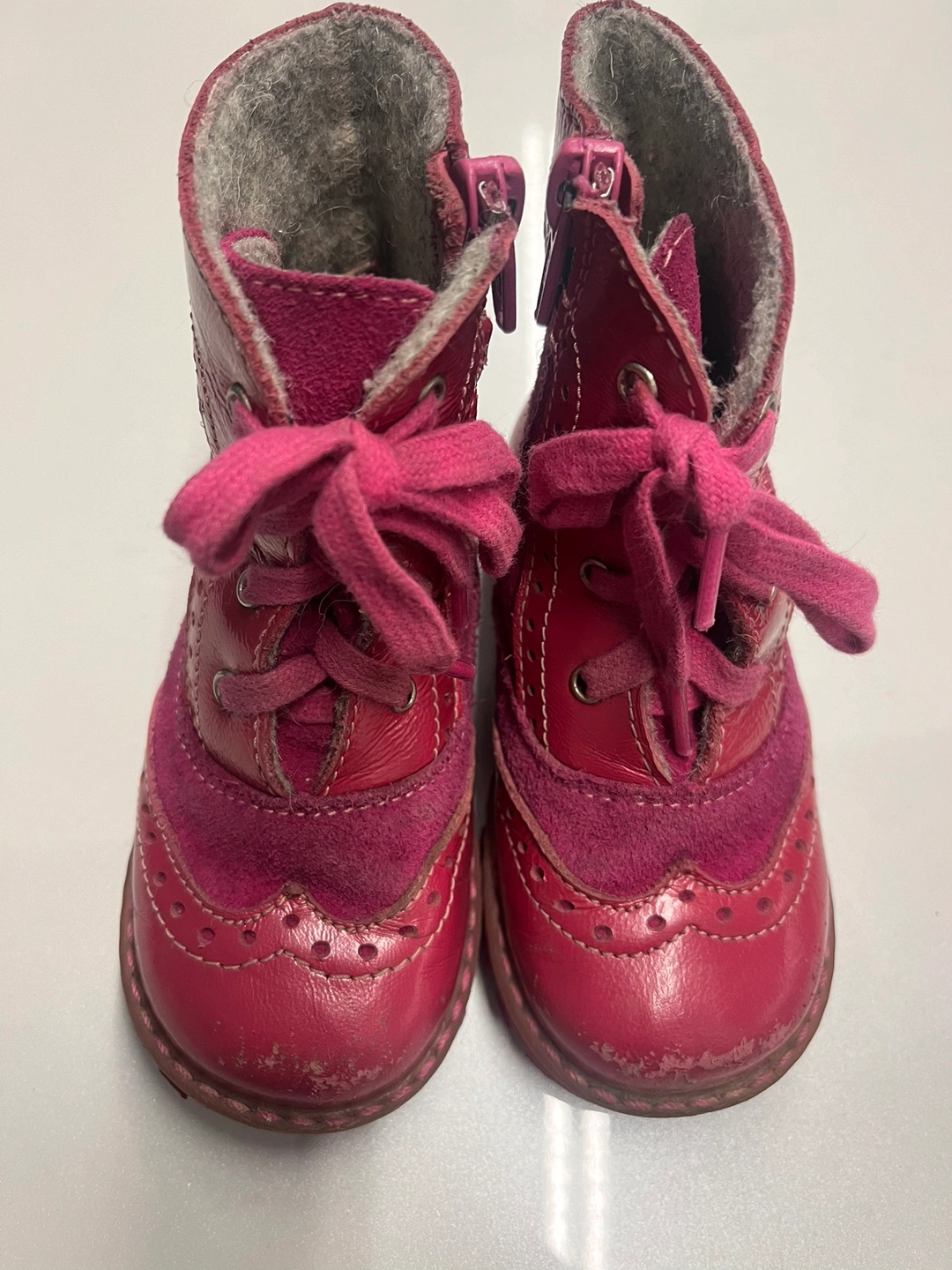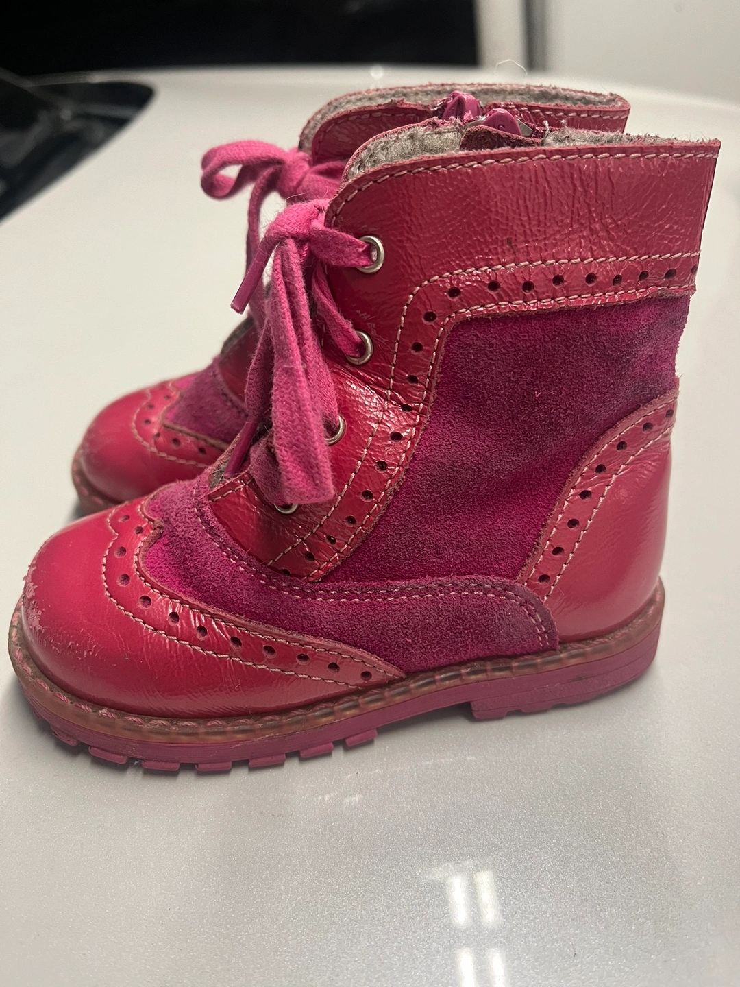 Pink leather kids boots with laces and a zipper. Lined with a soft grey material. Pet free smoke free home