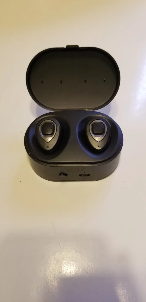 Wireless earbuds with charging case. Black in colour. Include charging cable.