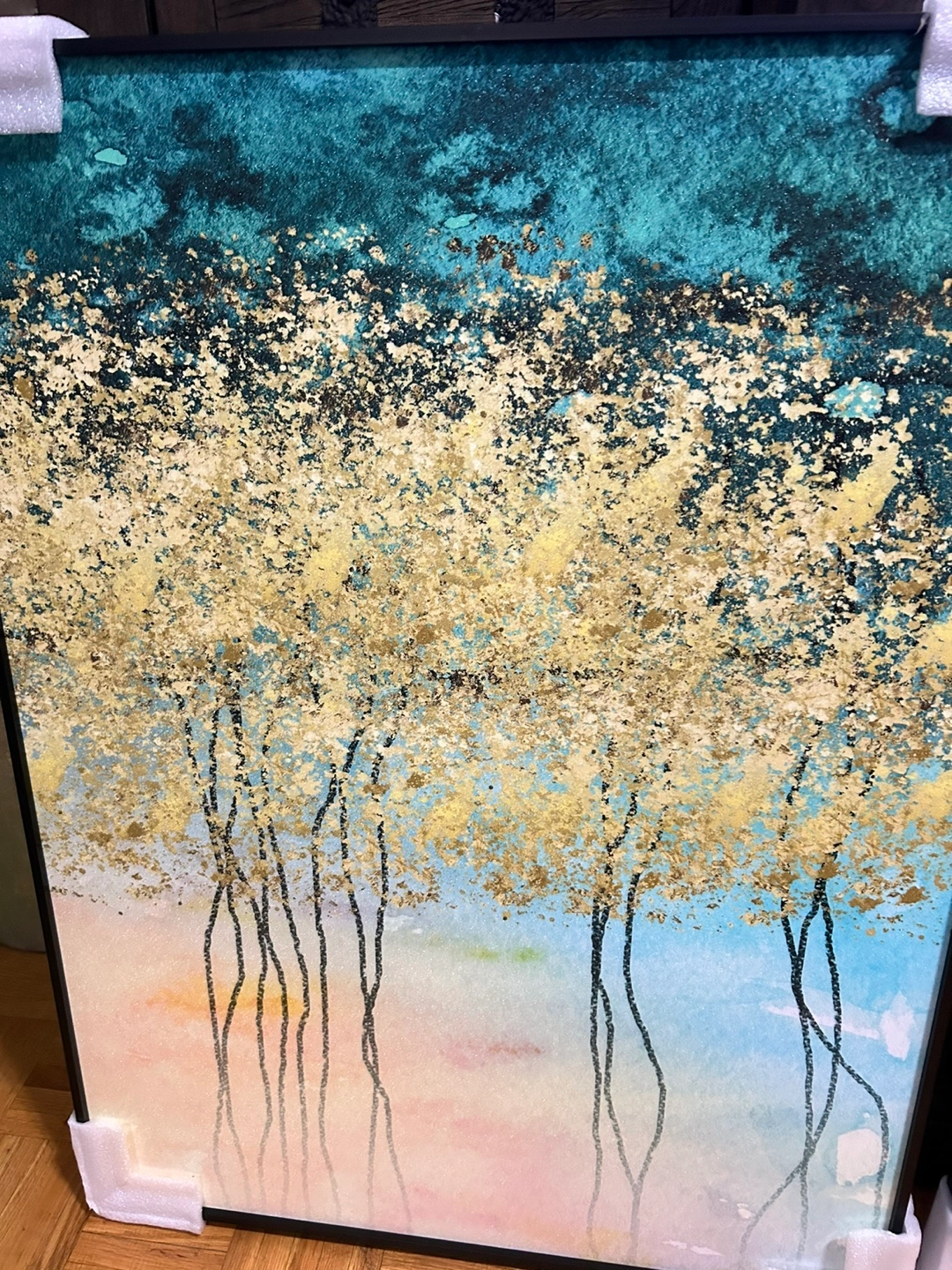 Abstract canvas of trees with golden leaves on a teal and blue background. Each 24”W by 32”H by 1.5”D canvas is framed in black and ready to hang. Intended as a set but willing to sell individually as well. As a set $90 (with box) Otherwise each piece (no box) $35. Price FIRM Leslie/Hwy 401