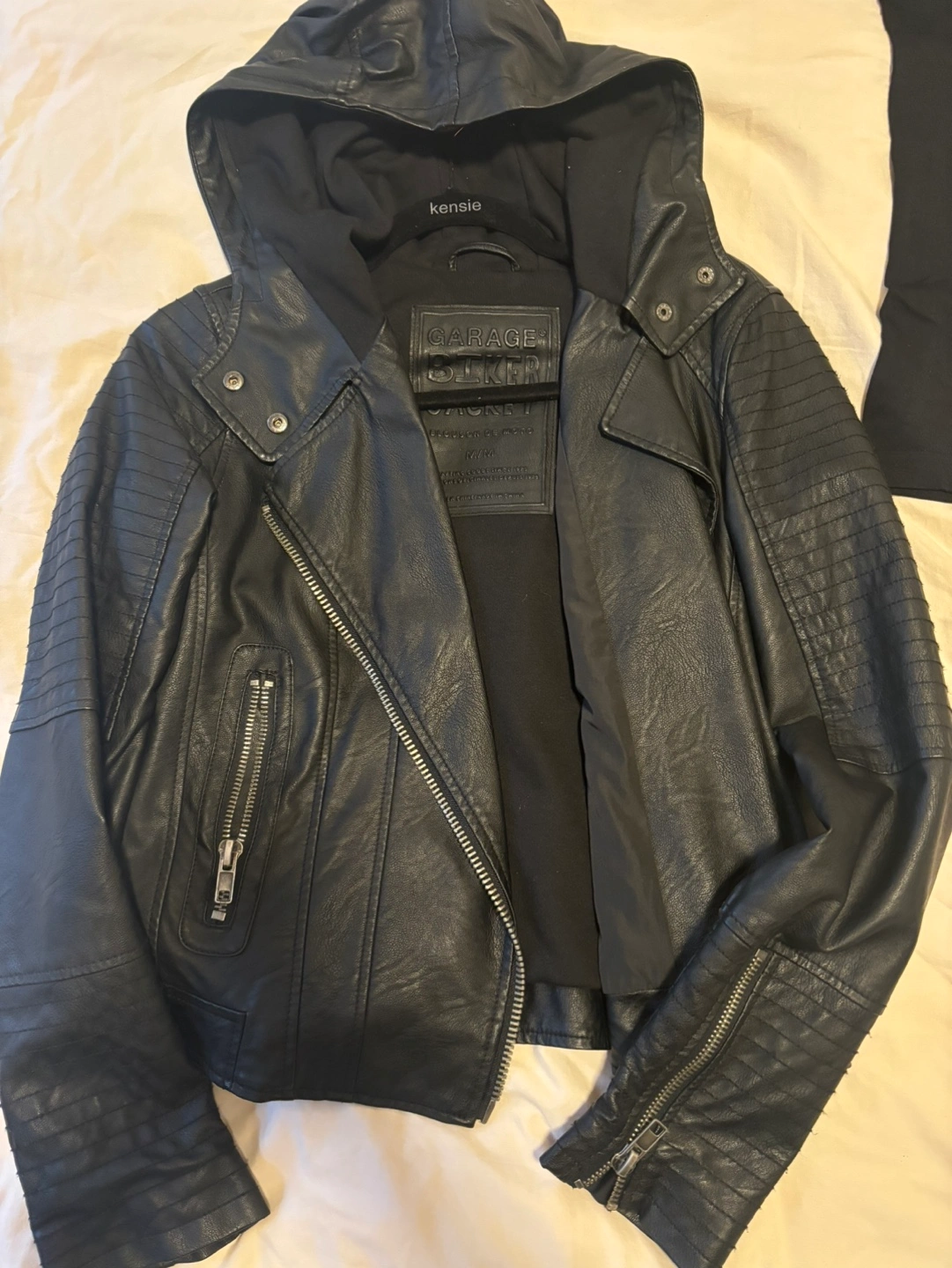 Black faux leather jacket with a hood. Zip closure. Long sleeves. Two zippered pockets on the front.