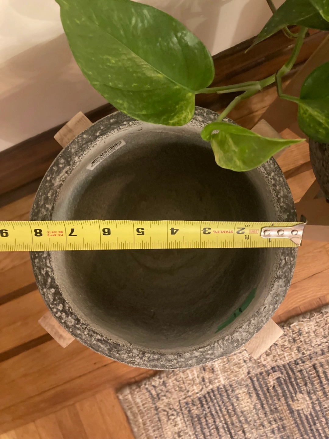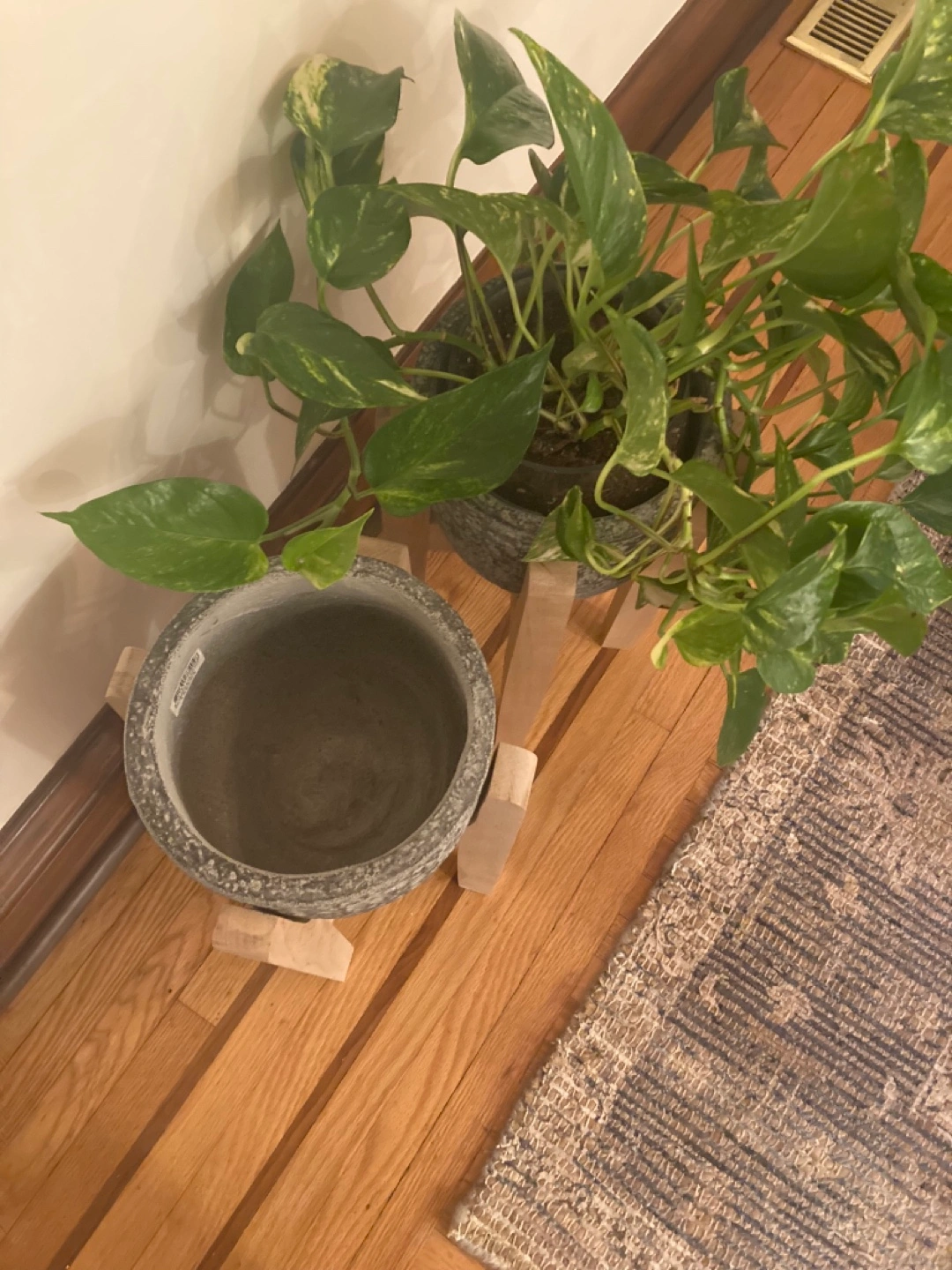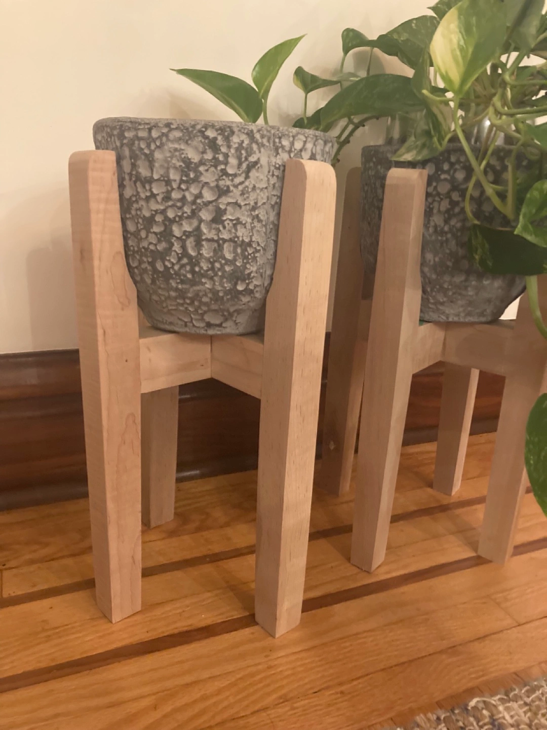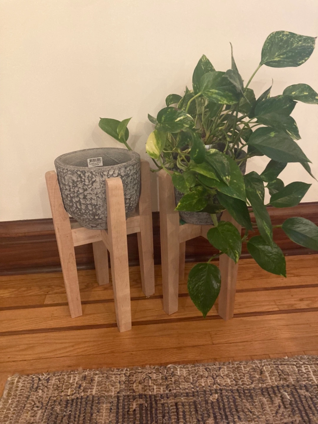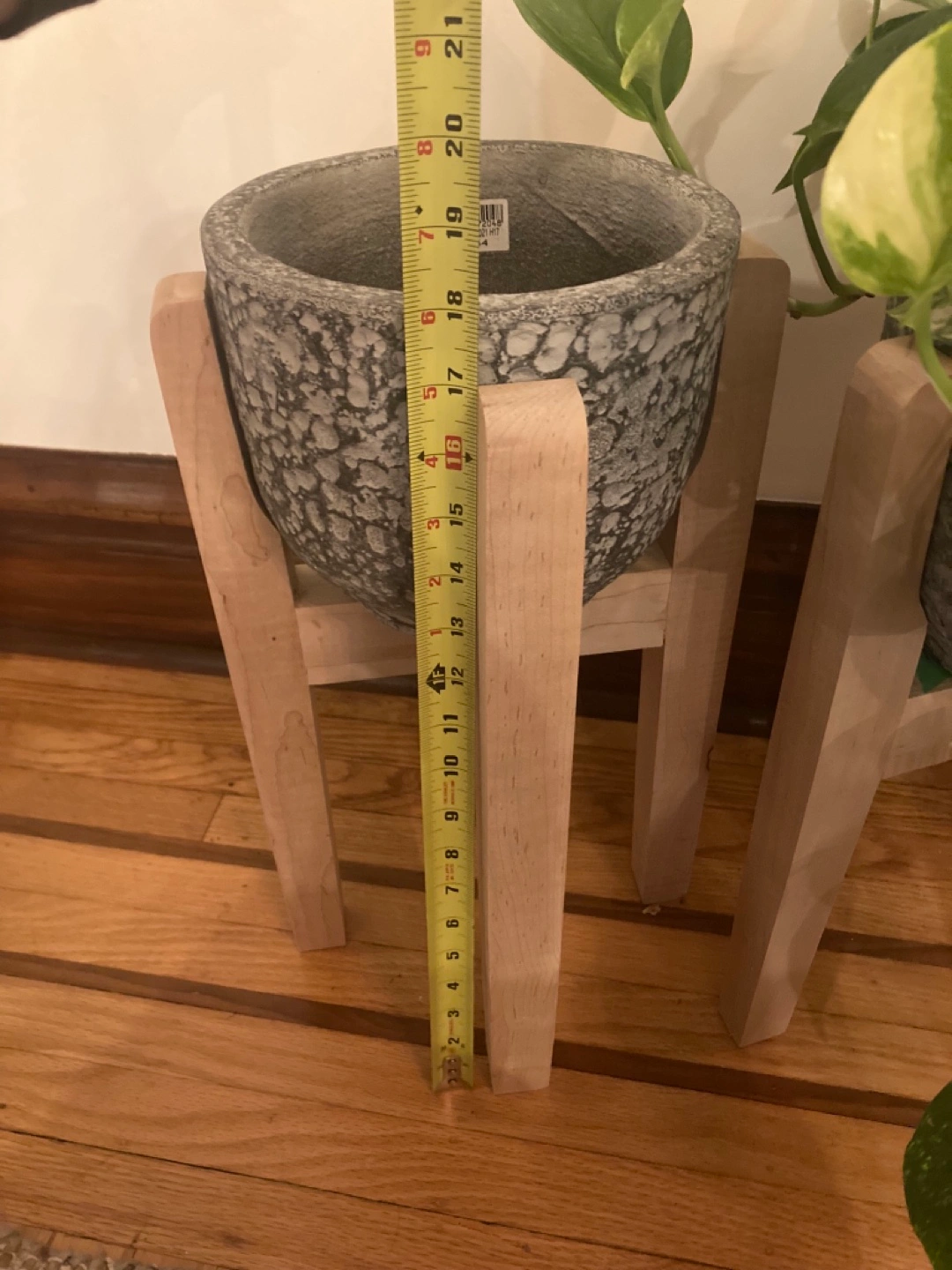 Two beautiful floor plant stands. Potters are made of concrete material. Wood may be stained for an additional fee. Plant not included. See pictures for measurements.
