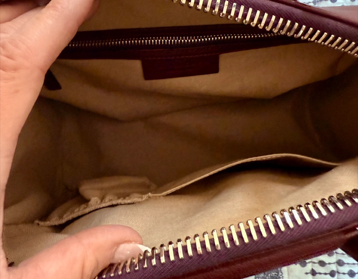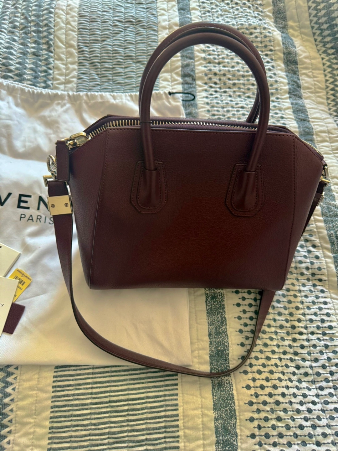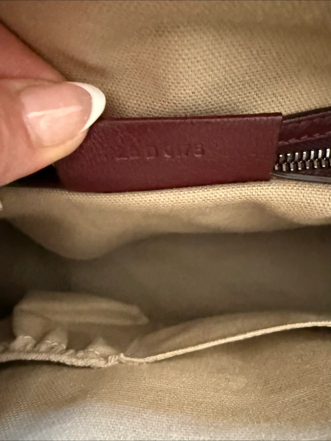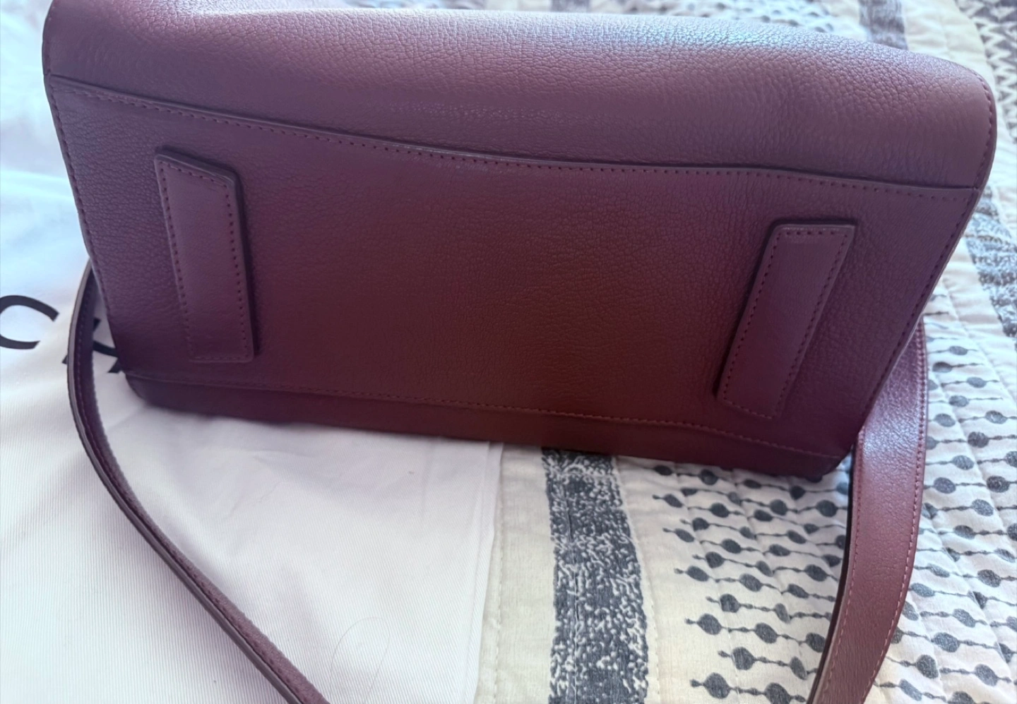 Burgundy leather handbag with top handles and a detachable shoulder strap. Comes with dust bag as well.