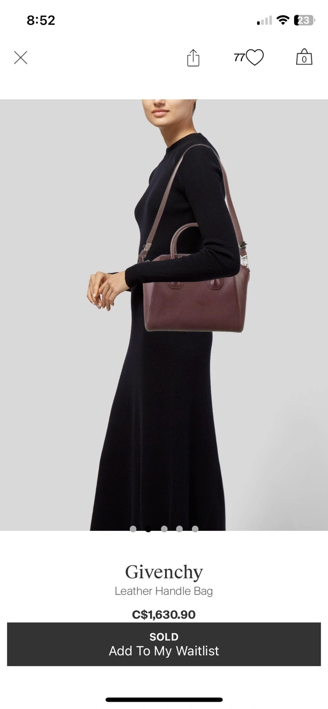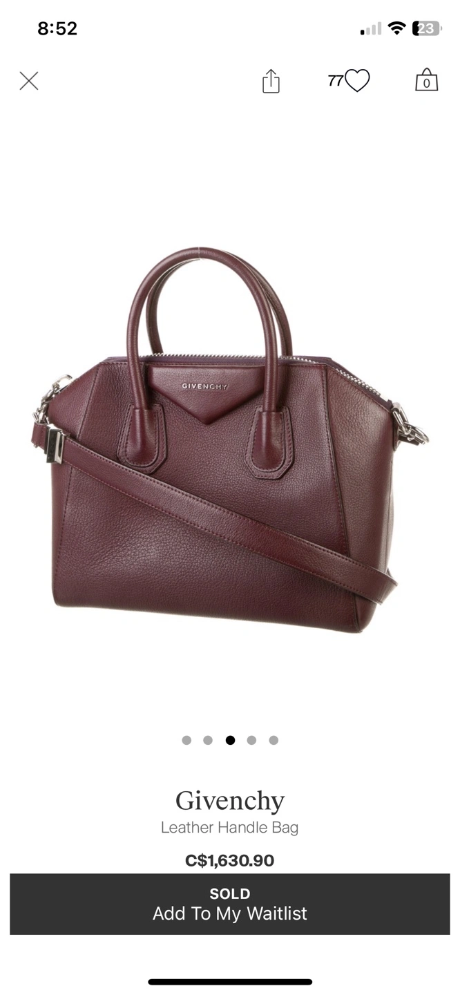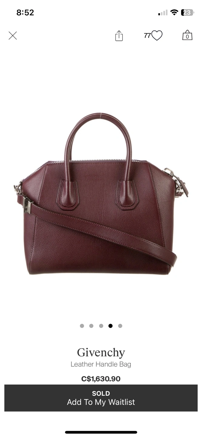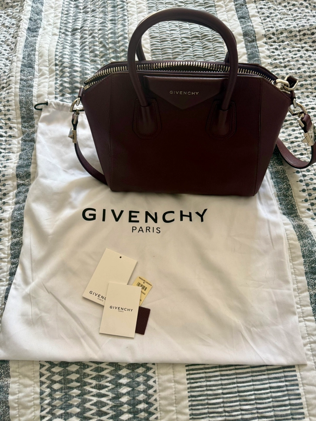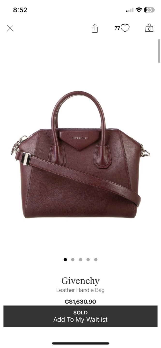 Burgundy leather handbag with top handles and a detachable shoulder strap. Comes with dust bag as well.