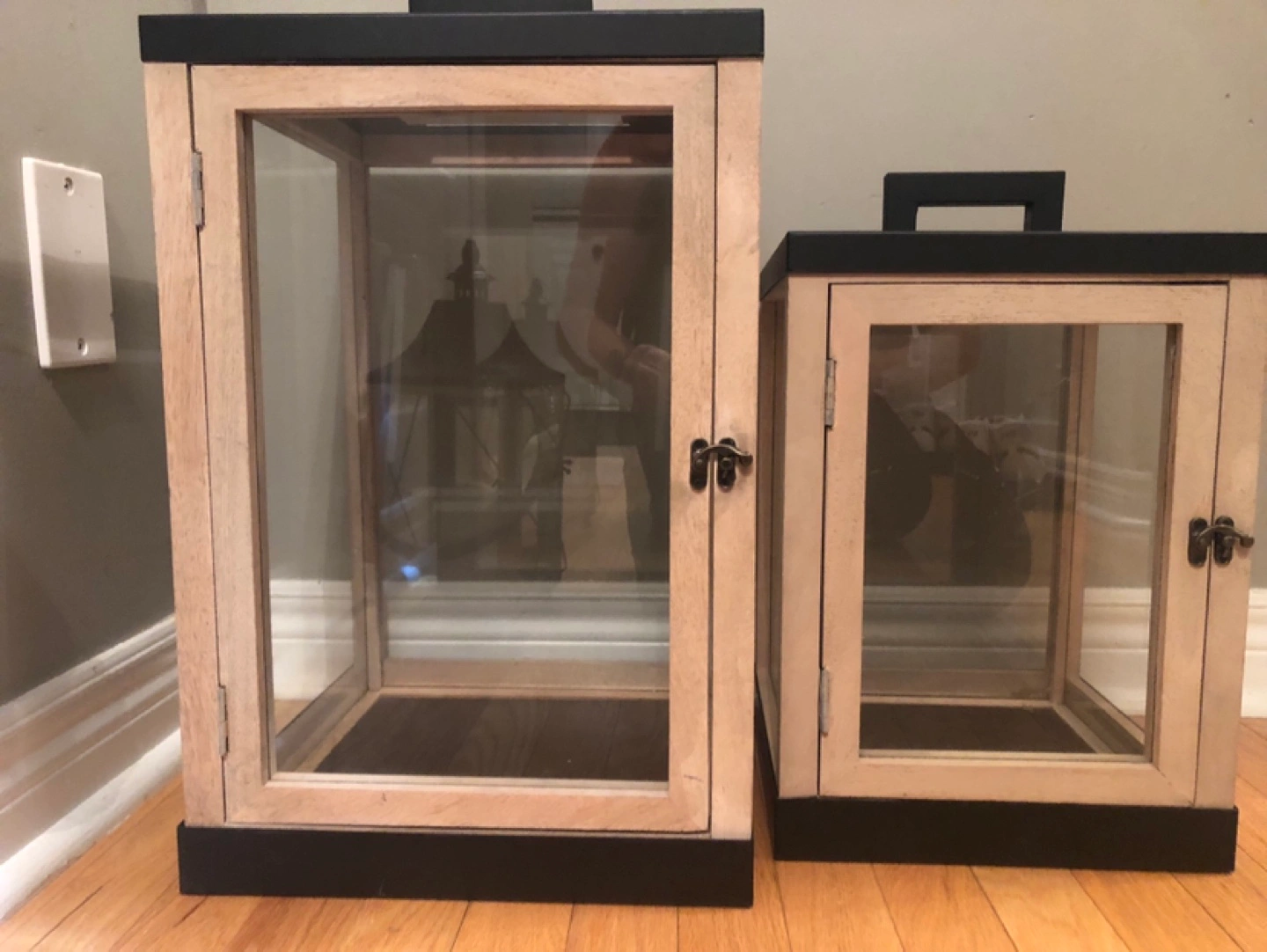 Two glass lanterns, one large and one small. Wooden frame with black trim. Large 80 Small 60 Pick up in Newmarket