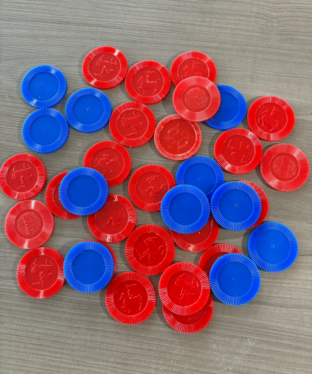 (AI says) Set of red and blue poker chips. 35 pcs. From dad’s collection. :) Click on my name above to see my other listings and pickup locations.