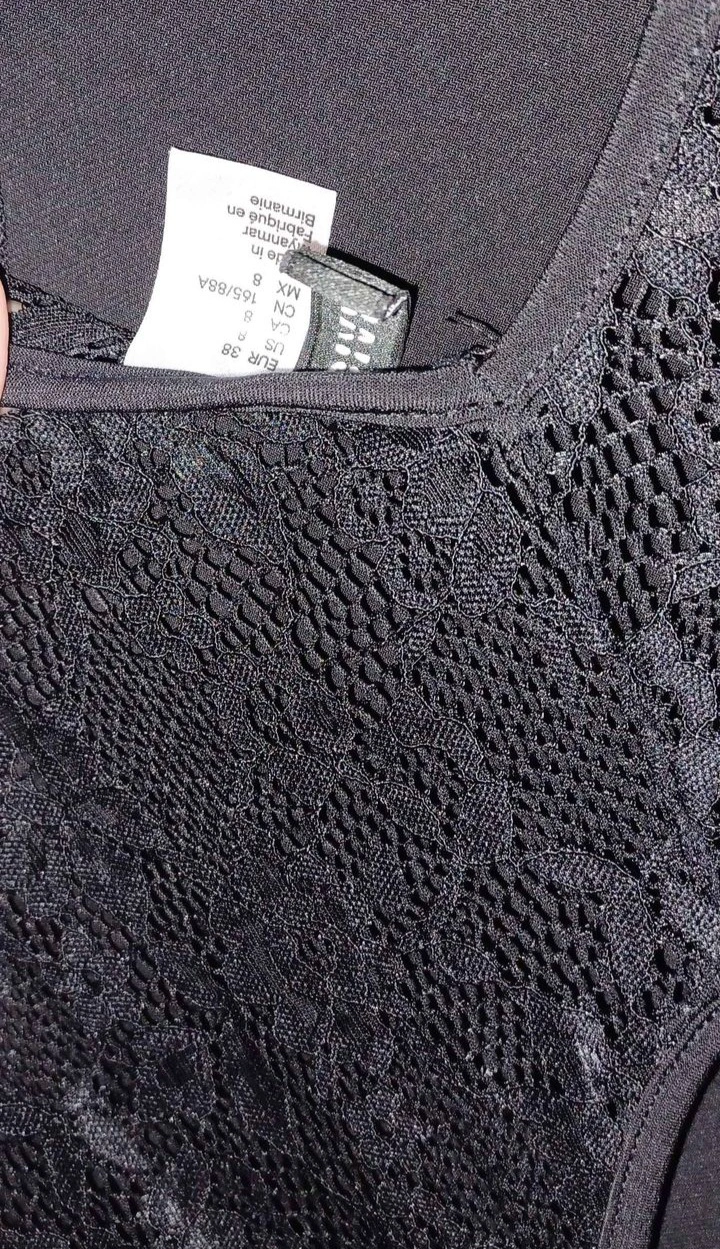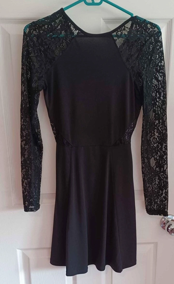 Black lace long sleeve dress with a keyhole cutout. It's a skater style, so it flares out from the waist. The lace sleeves are sheer. Size 8, Sleeves and back is lace, Back is open, Colour Black. No issues, The dress will be more elegant if worn with a belt.