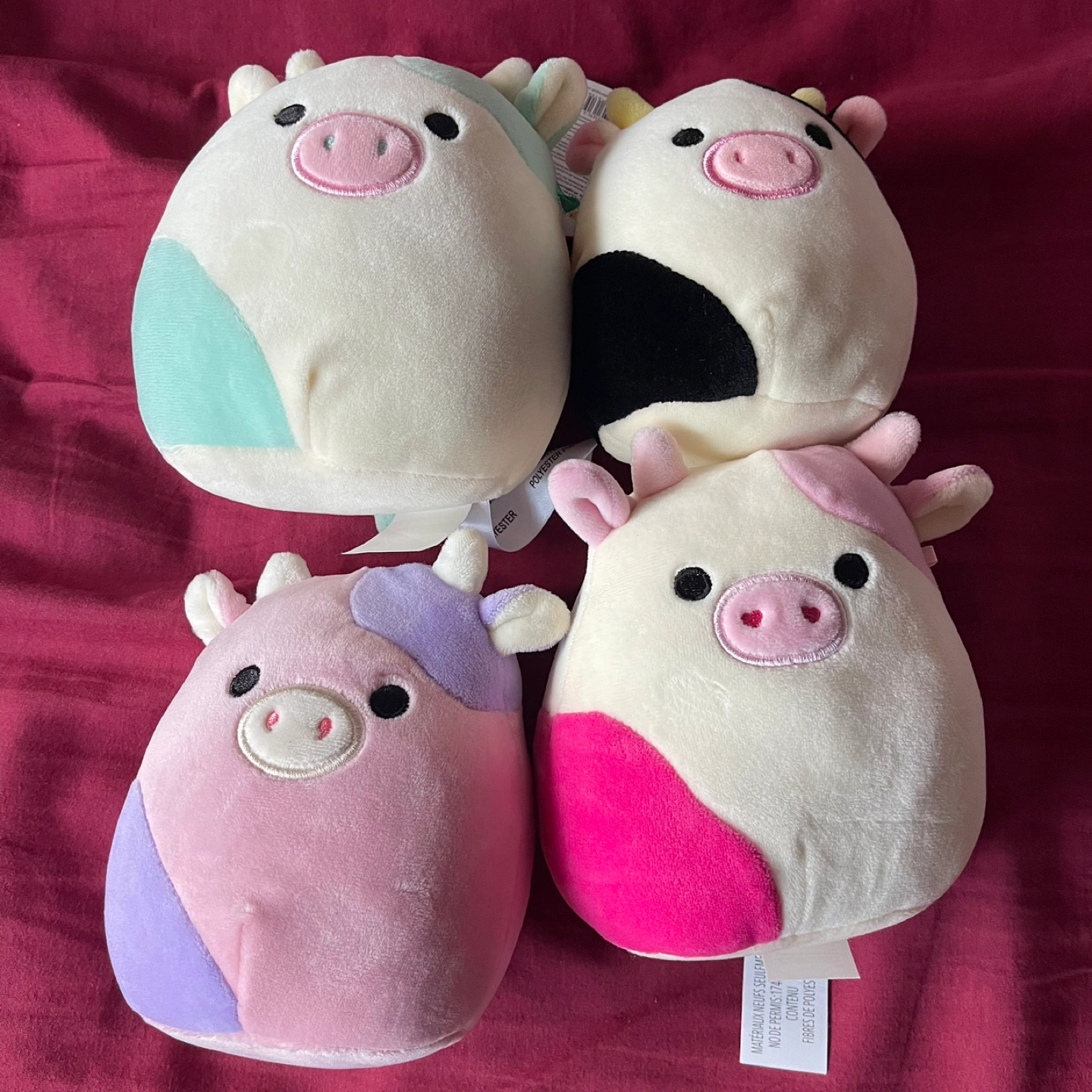 Set of 4 Squishmallow cow plushes. Each plush has a different colour pattern. They are all in good condition. some don’t come with bio tags