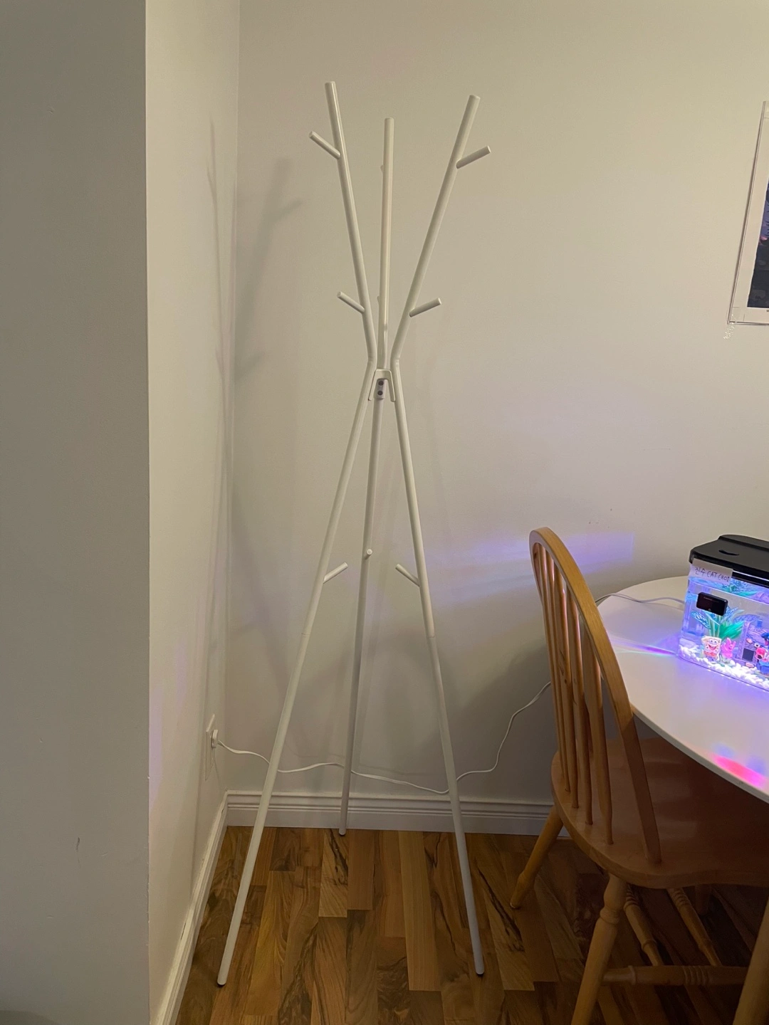 White coat rack, free standing. Good condition. Hat and coat stand.