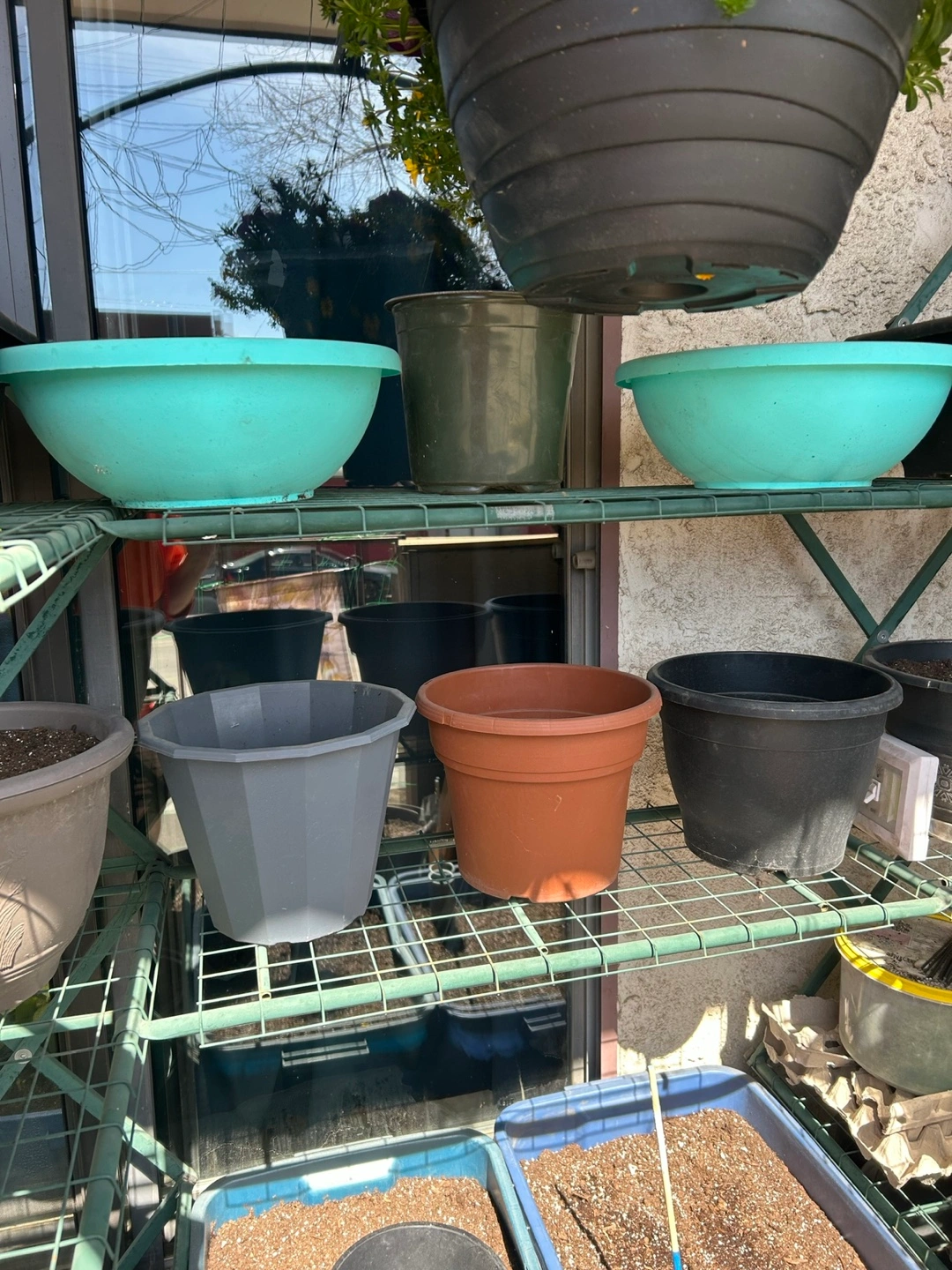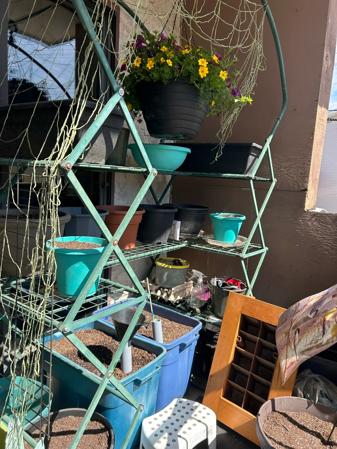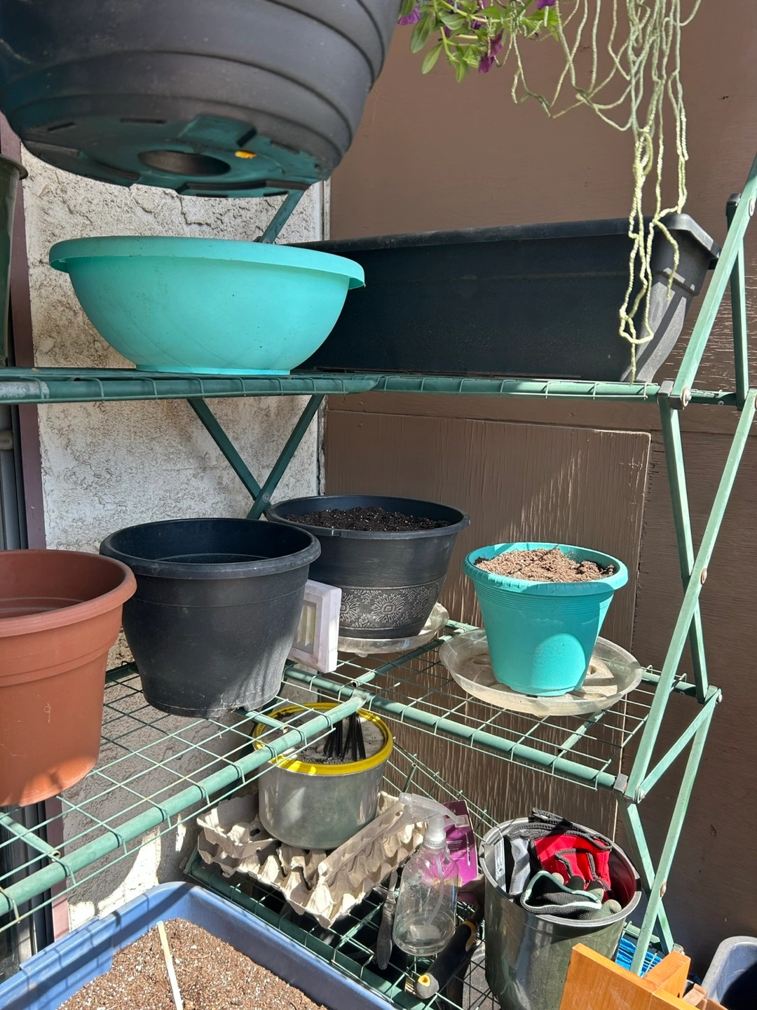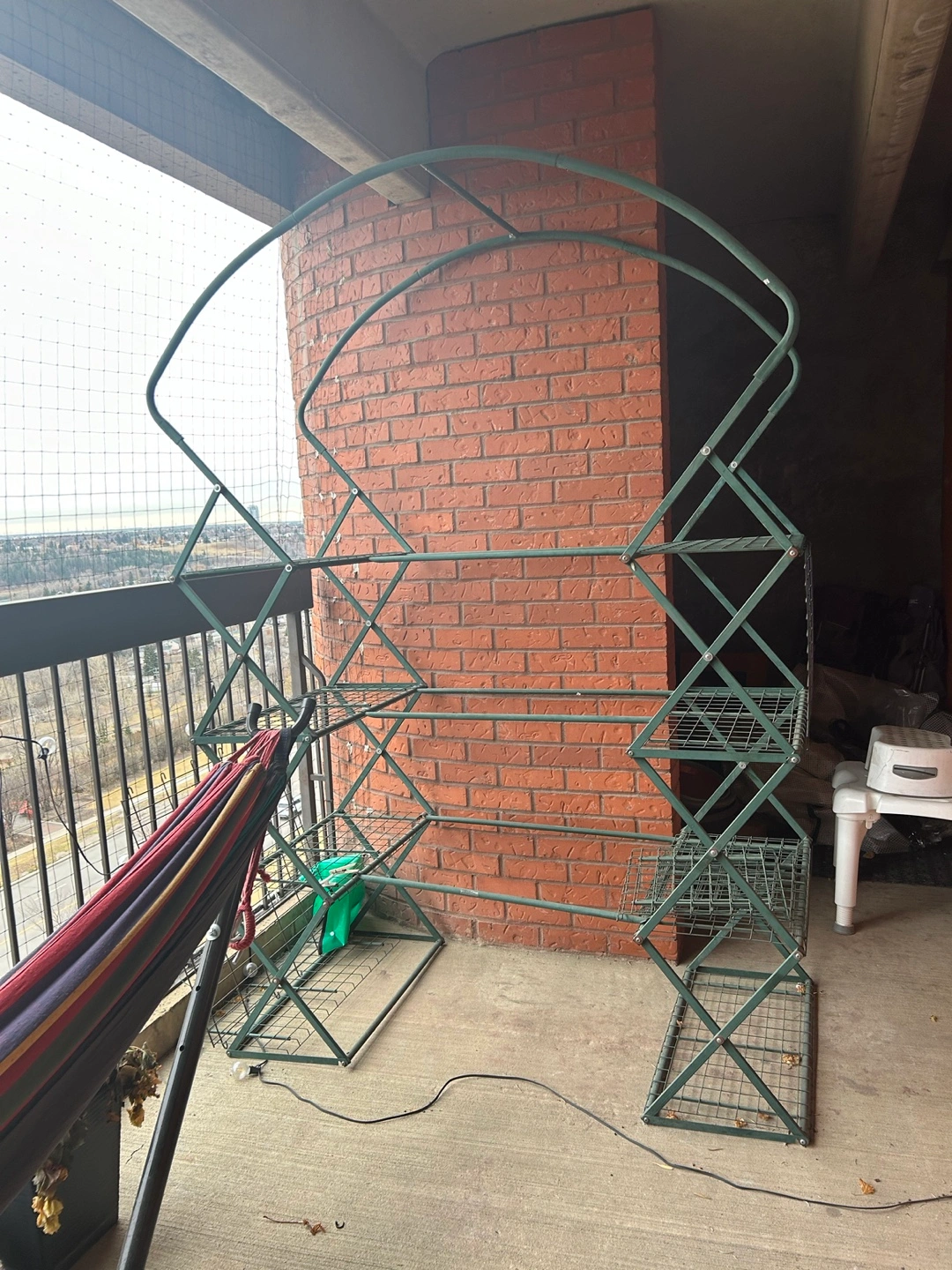 Metal plant stand, great for a balcony or patio. Has four shelves. Some rust but powder coated in good condition.