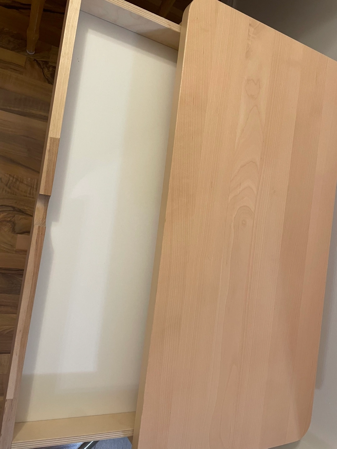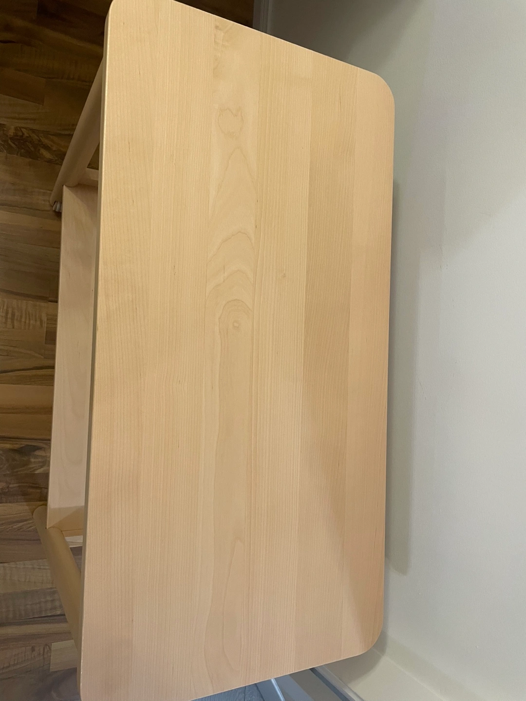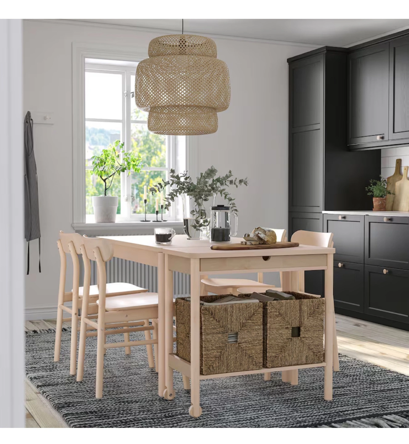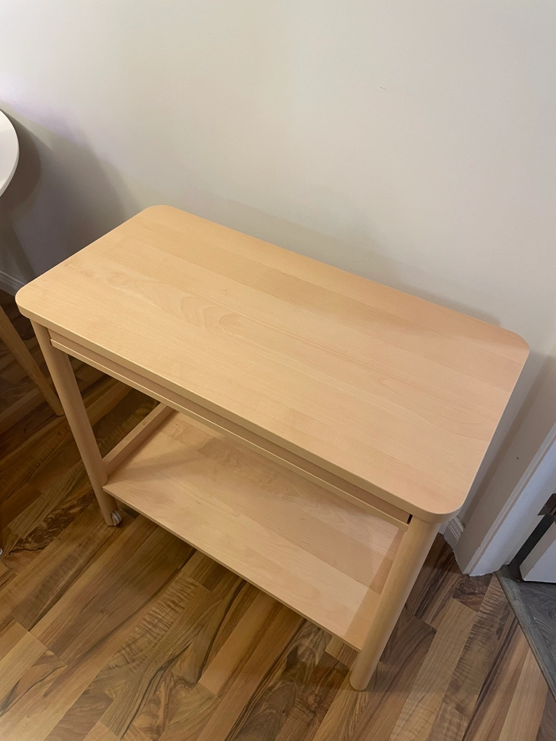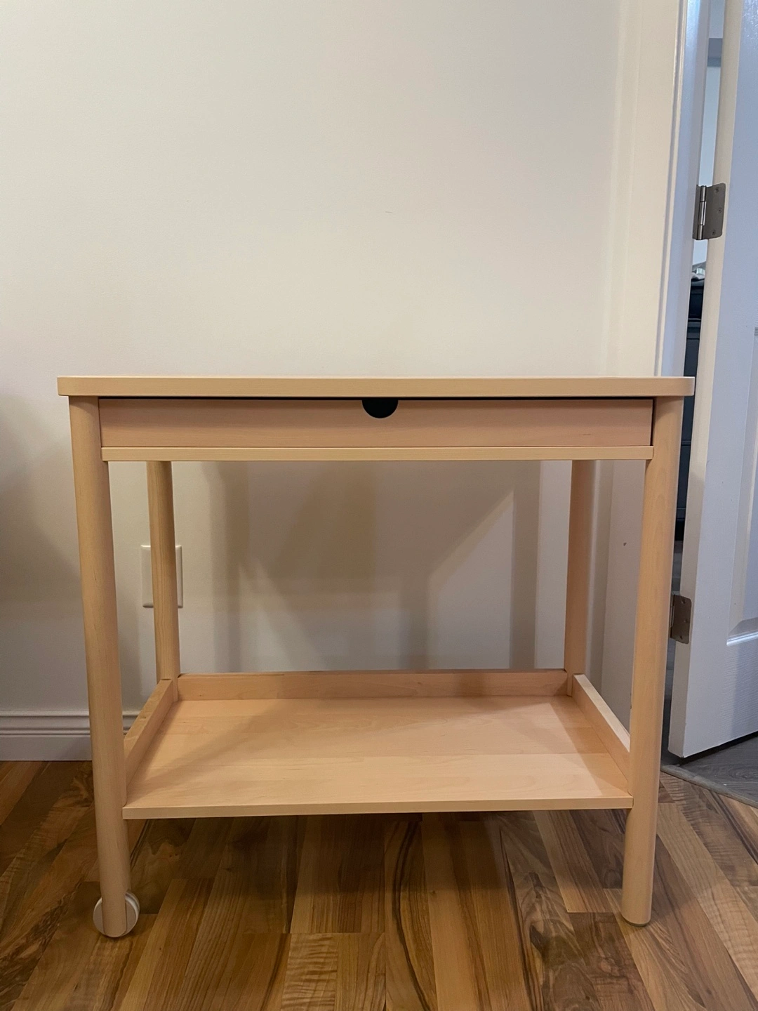 Rolling kitchen cart with a drawer and a shelf. It is made of wood with a light colour finish. Great for use in a kitchen or a living room. https://www.ikea.com/ca/en/p/roenninge-utility-cart-birch-50507488/
