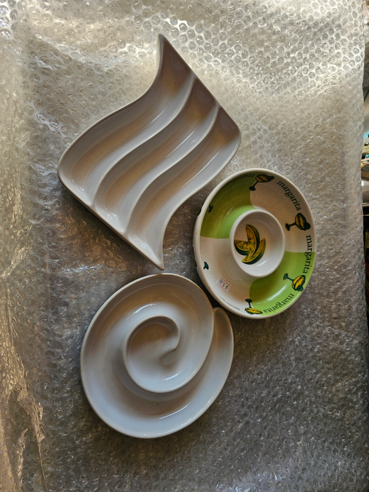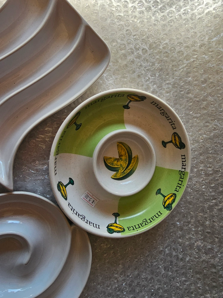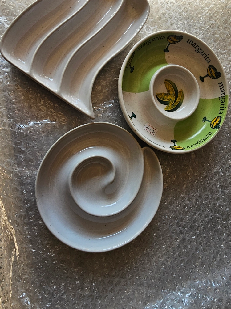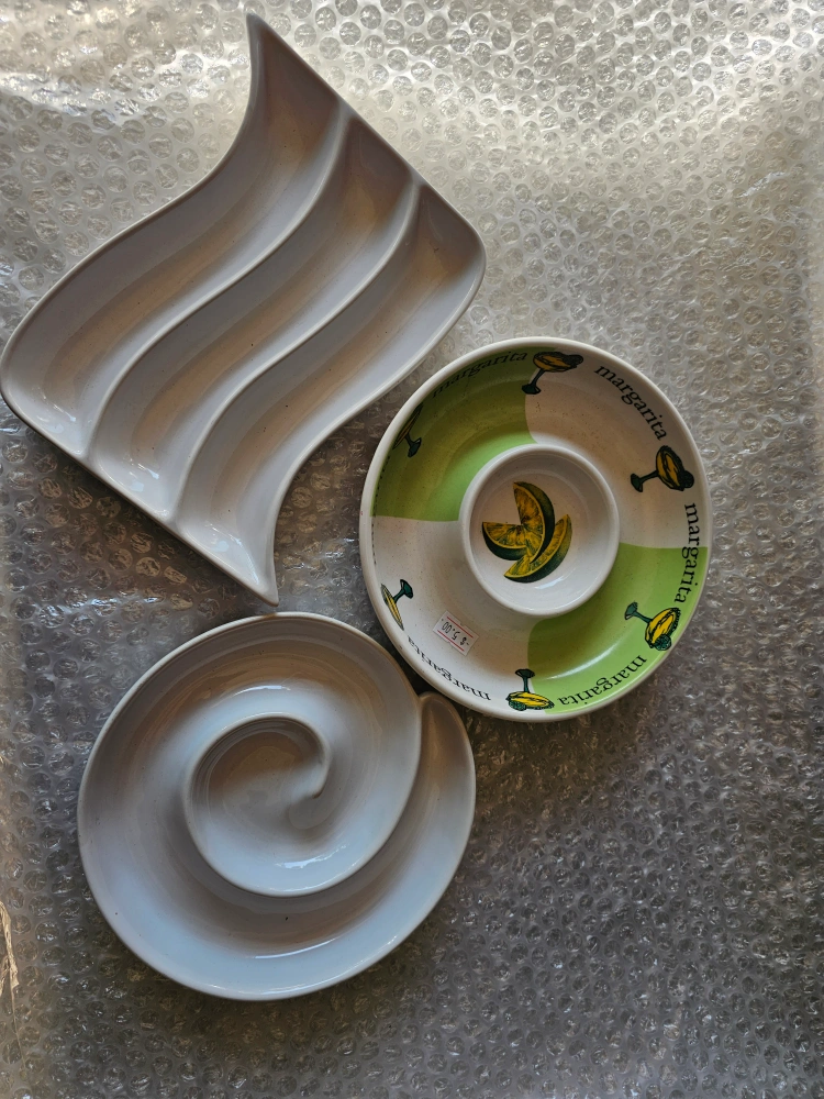 Set of 3 ceramic margarita dishes. One has a swirl design, one is a long rectangle, and one is a round dish with lime wedges. The round dish says margarita on it.