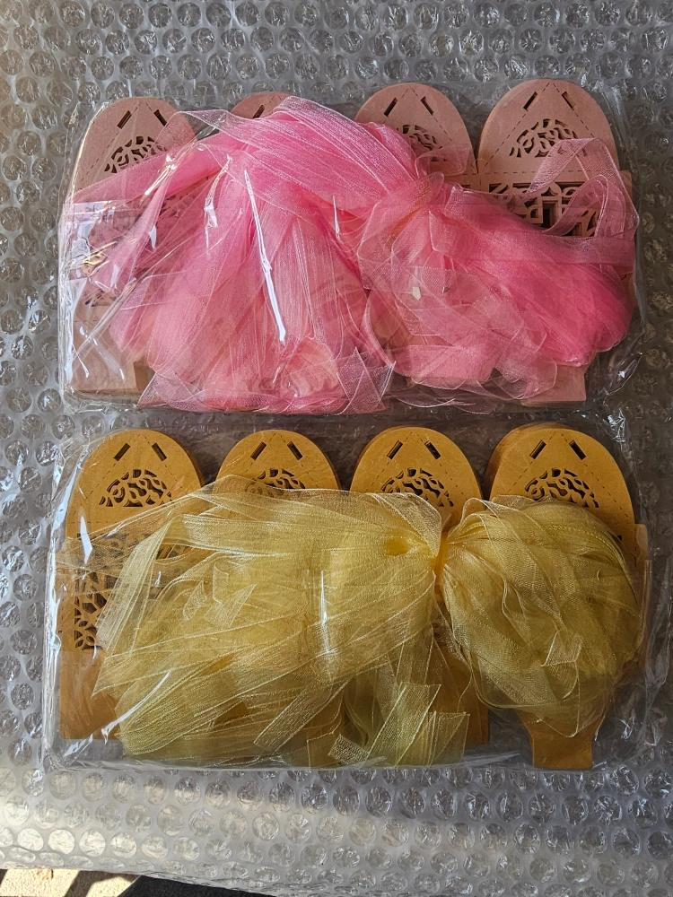 50 pk favour boxes. Pink & yellow gold. Each box includes a ribbon. Made of paper. Cross design with a cut-out pattern. Perfect for wedding favours, christenings, or other special events. $5 ea