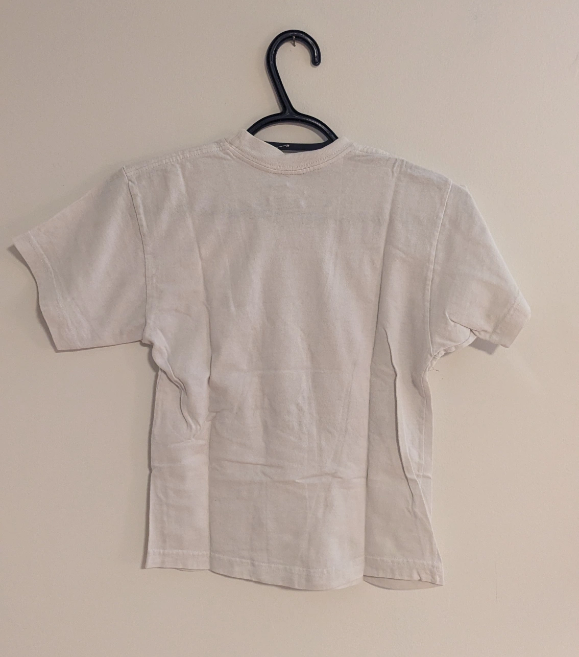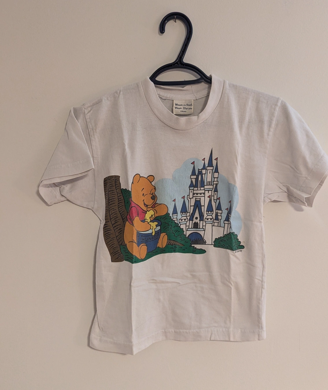 White short-sleeve t-shirt featuring Winnie the Pooh and a castle. Size S/P.