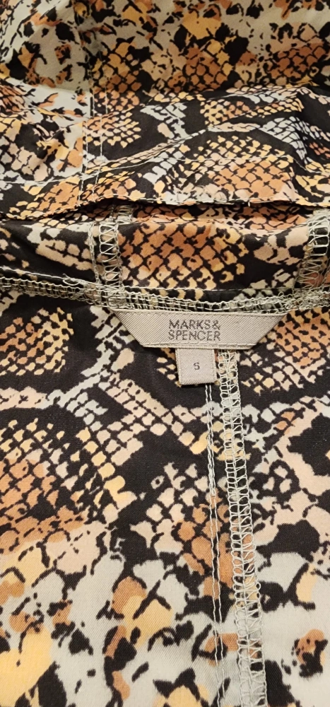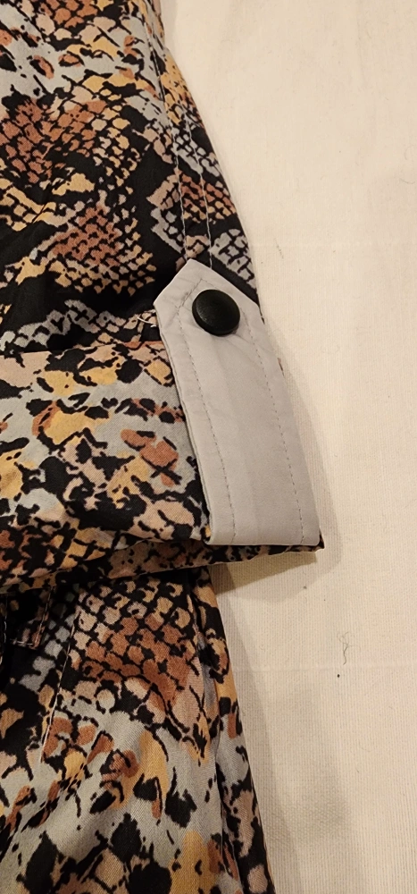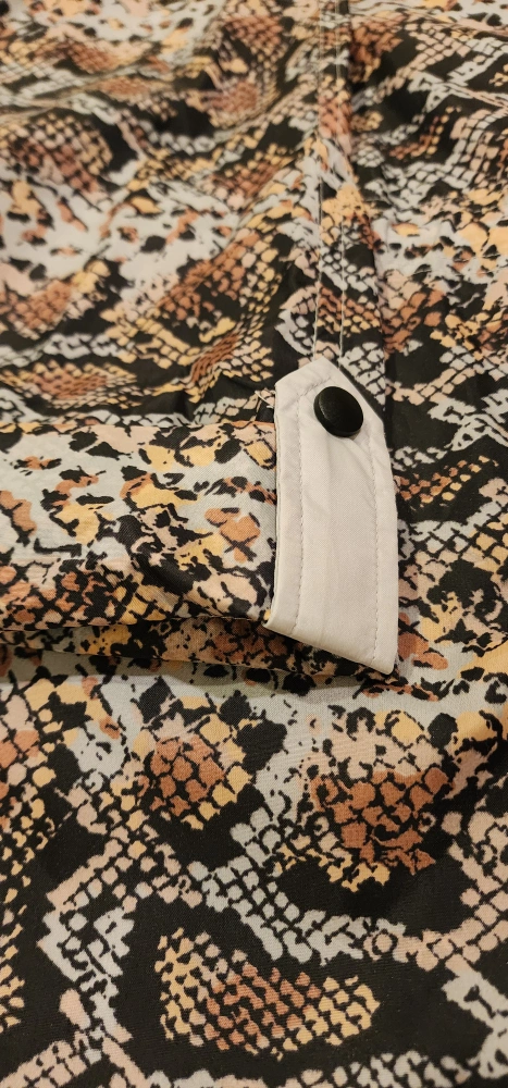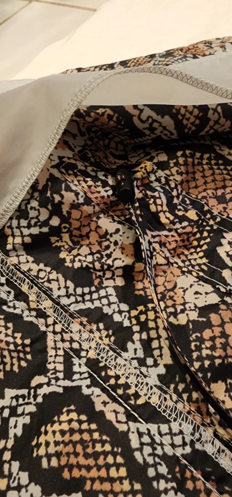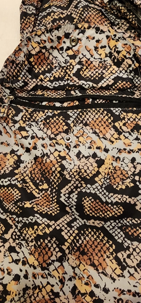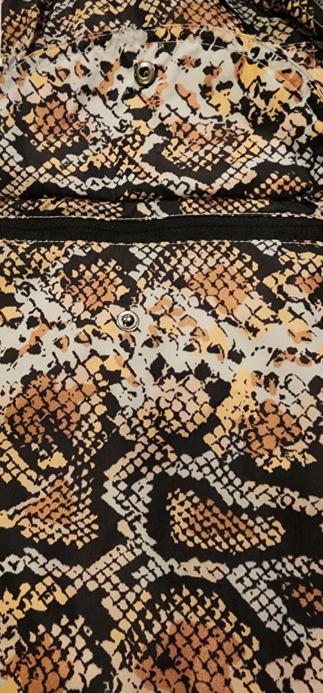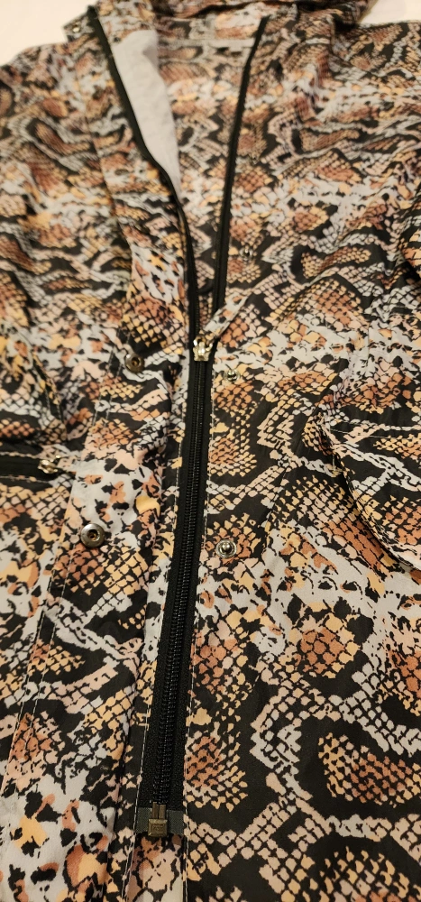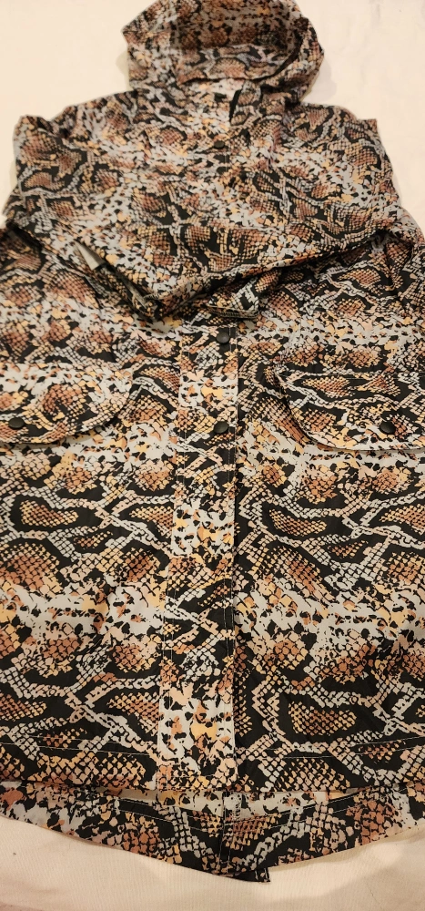 Lightweight jacket with a snakeskin print. Has a hood and two pockets. Long sleeves with button closures at the cuffs. Zipper closure and button closure at the front. Size - small Pick up- Moscrop Secondary School Parkinglot