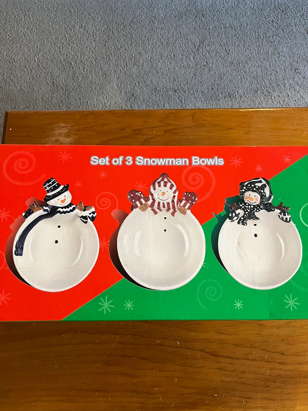 Set of 3 snowman bowls. Each bowl features a different snowman design. Not for microwave or dishwasher use.