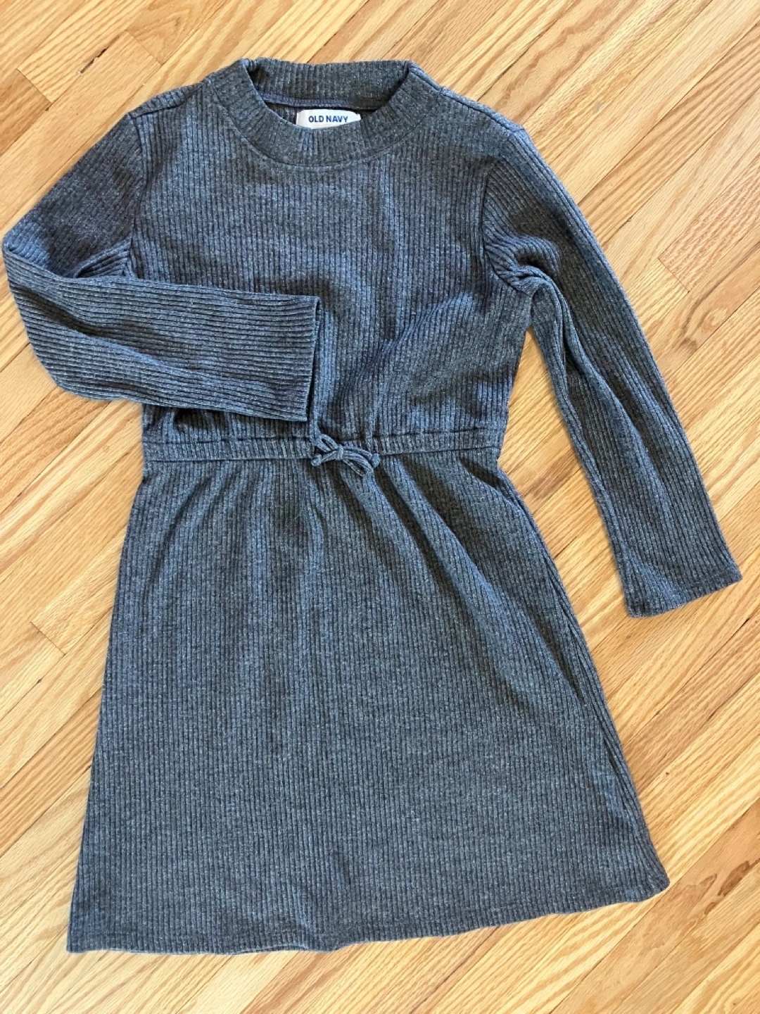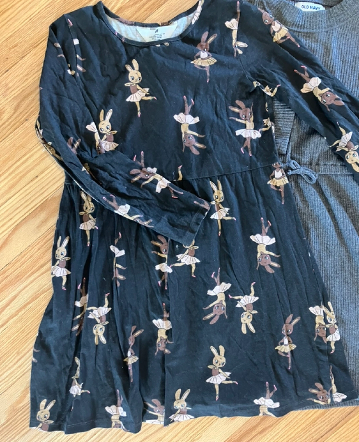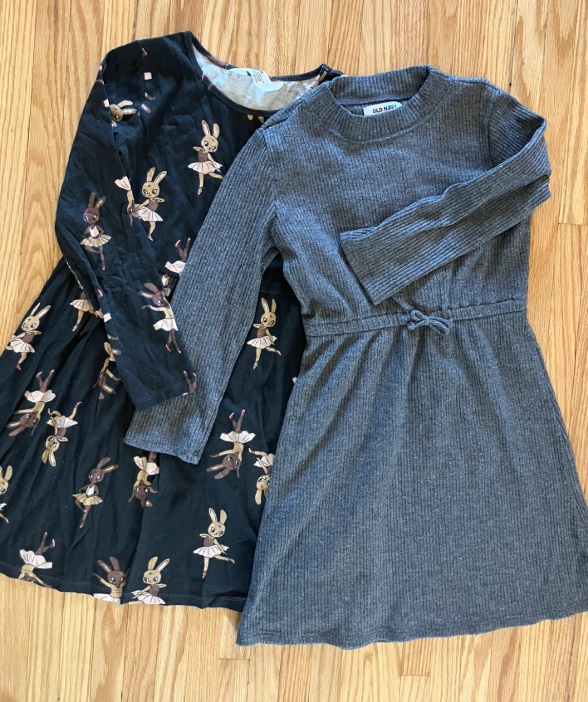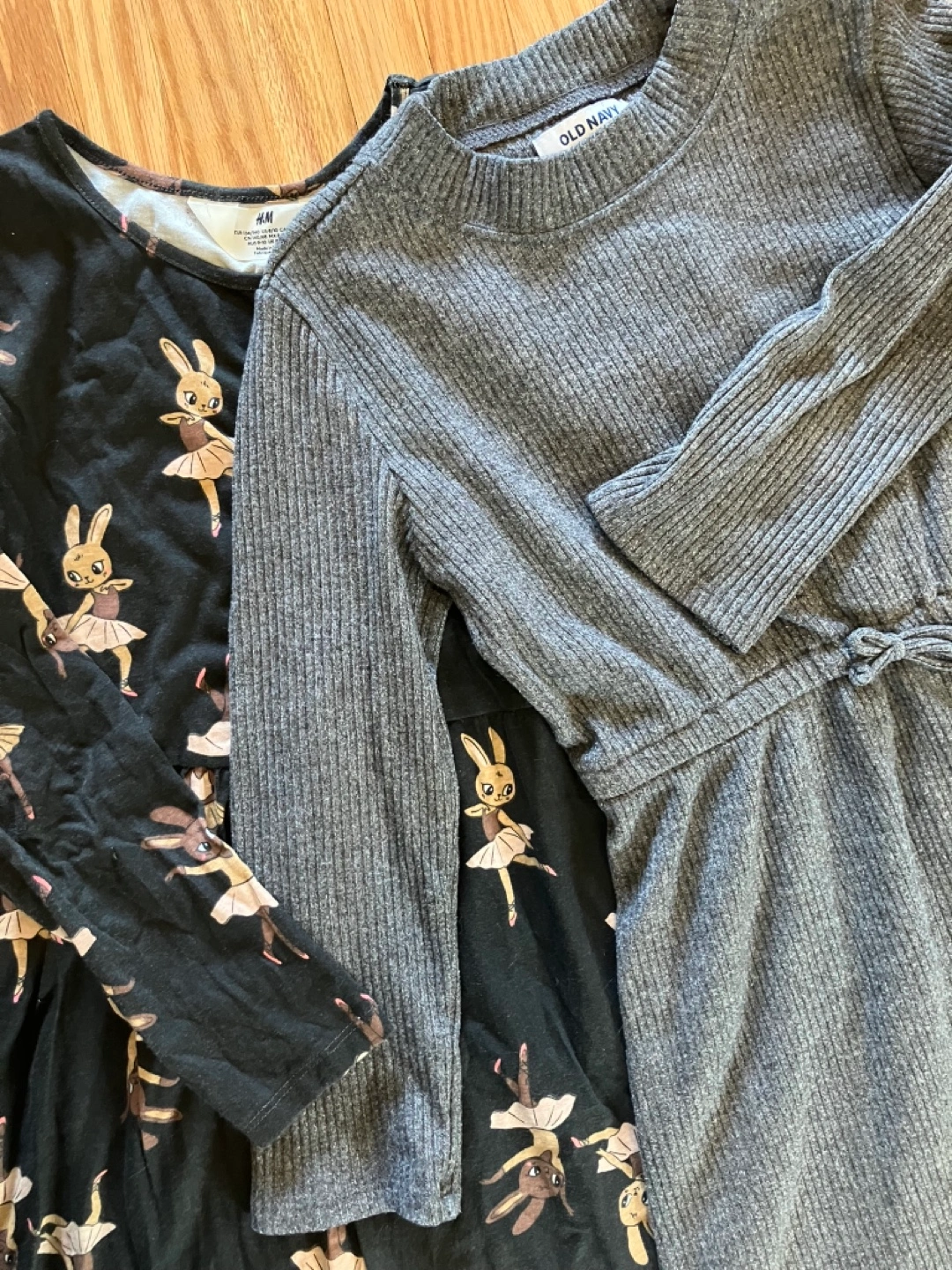 In good used condition! 2 pack of long sleeve dresses for the coming cozy weather. Grey ribbed dress - Old Navy [size M/8] Really comfy and soft dress with tiny bow detail around the waist. Very cute and minimal and is thicker material. Black bunny dress - H&M [size 8-10] Super cute ballet bunny design. Made of tshirt like material so kids won’t fight wearing it! Can be worn with tights as a dress or even over leggings as a long shirt. EASY PORCH PICKUP AVAILABLE