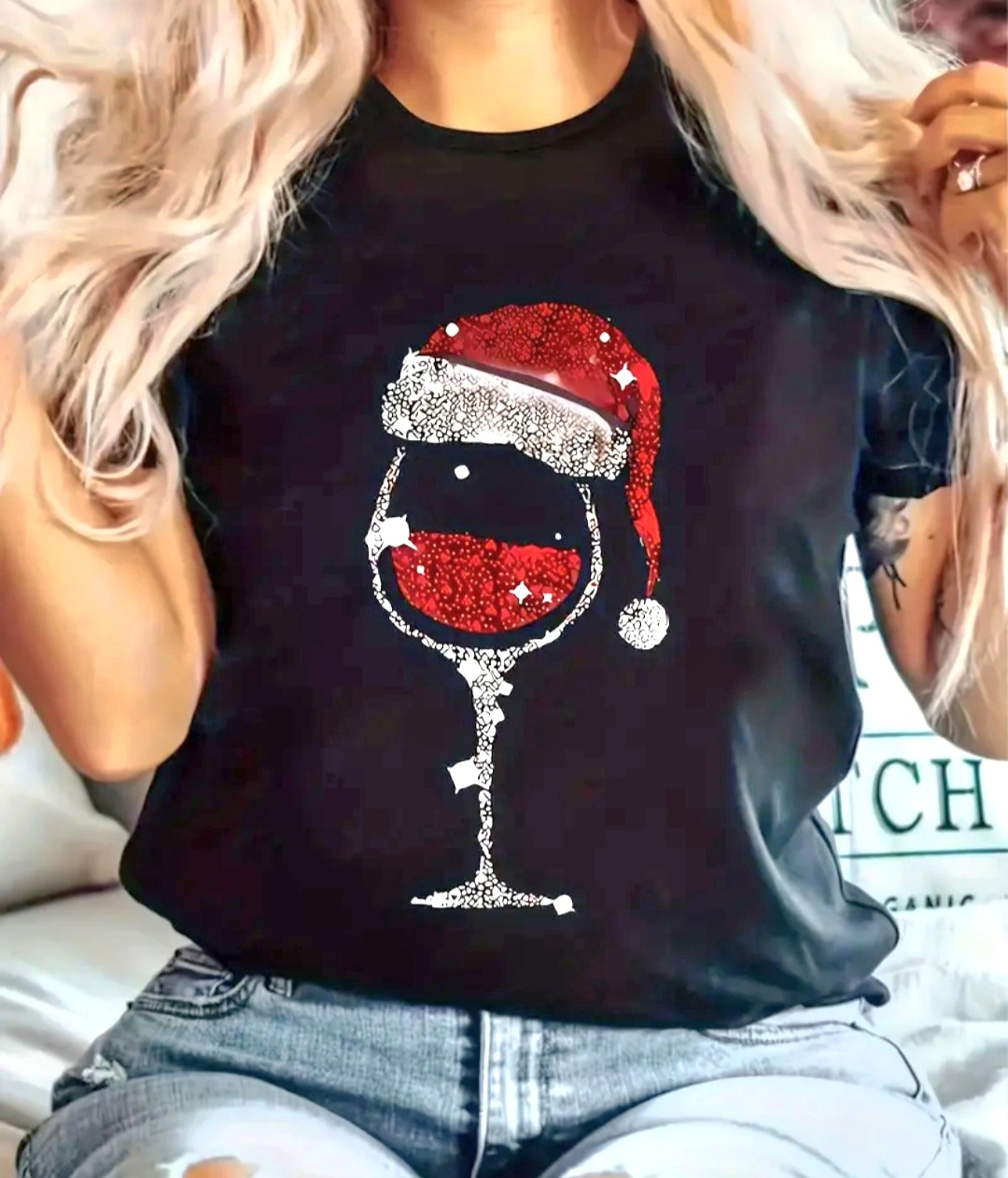 Black short-sleeved T-shirt with the seasonal winter design. Size : M