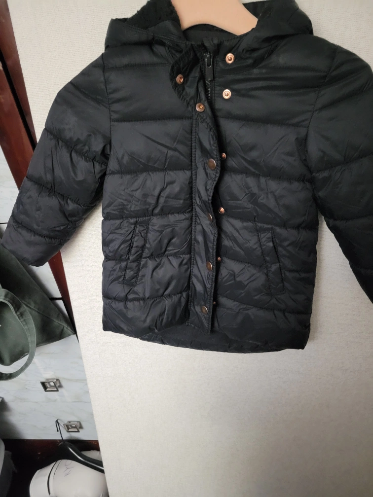 Black puffer jacket with fleece lining. Zipper and button closure. Two pockets.