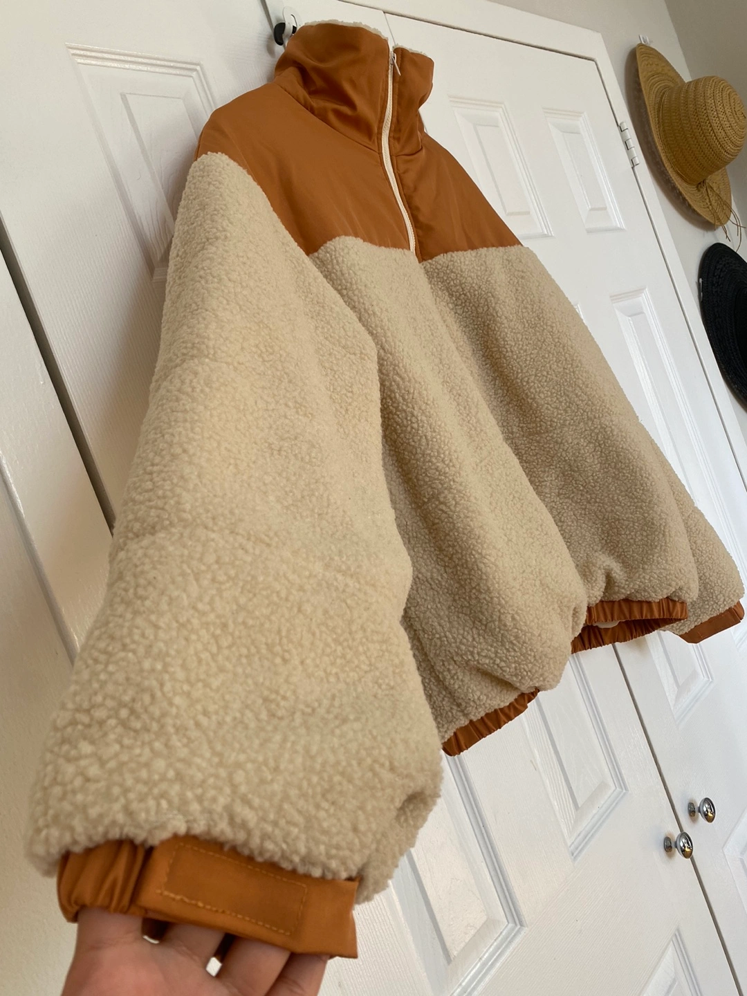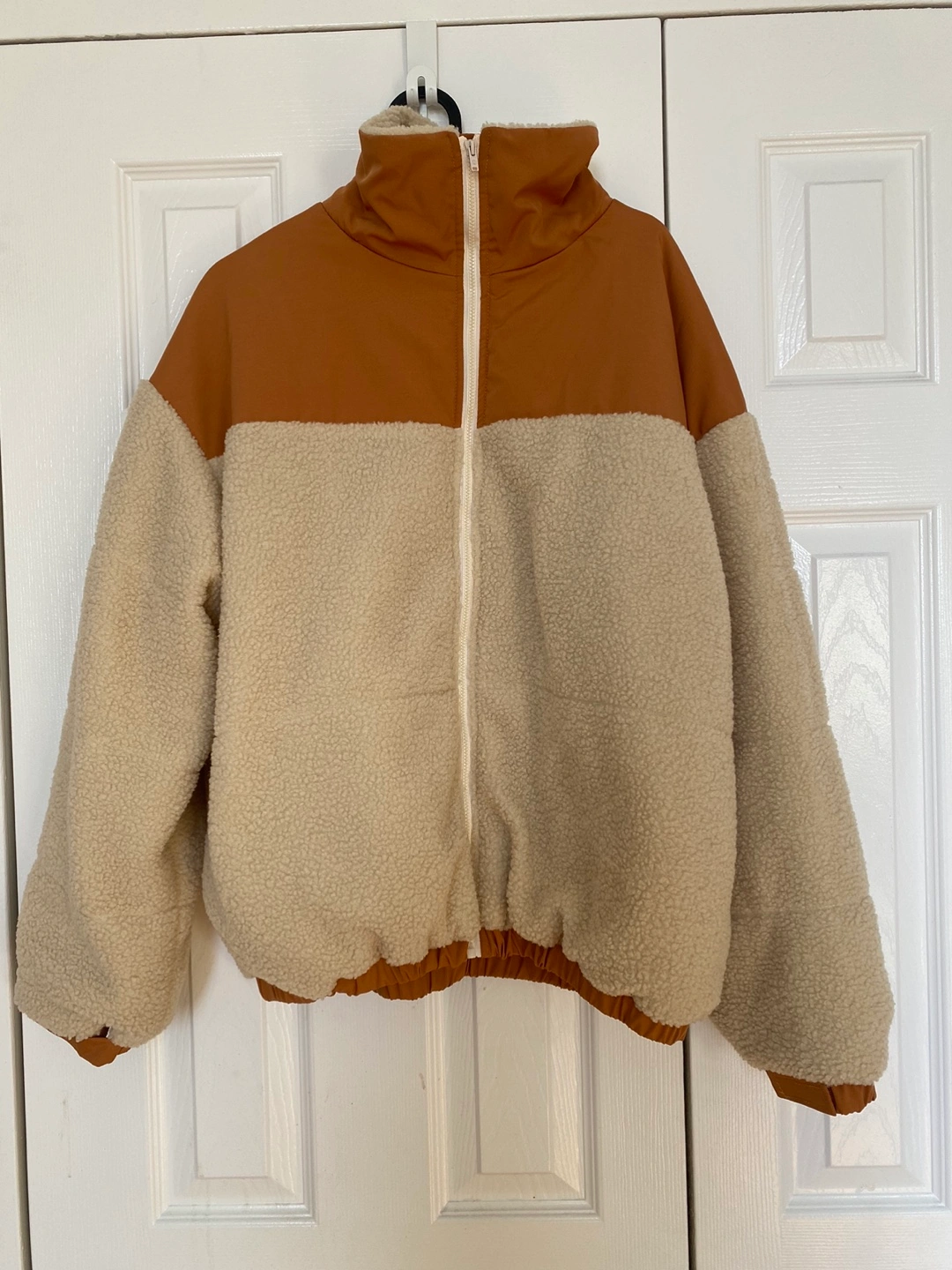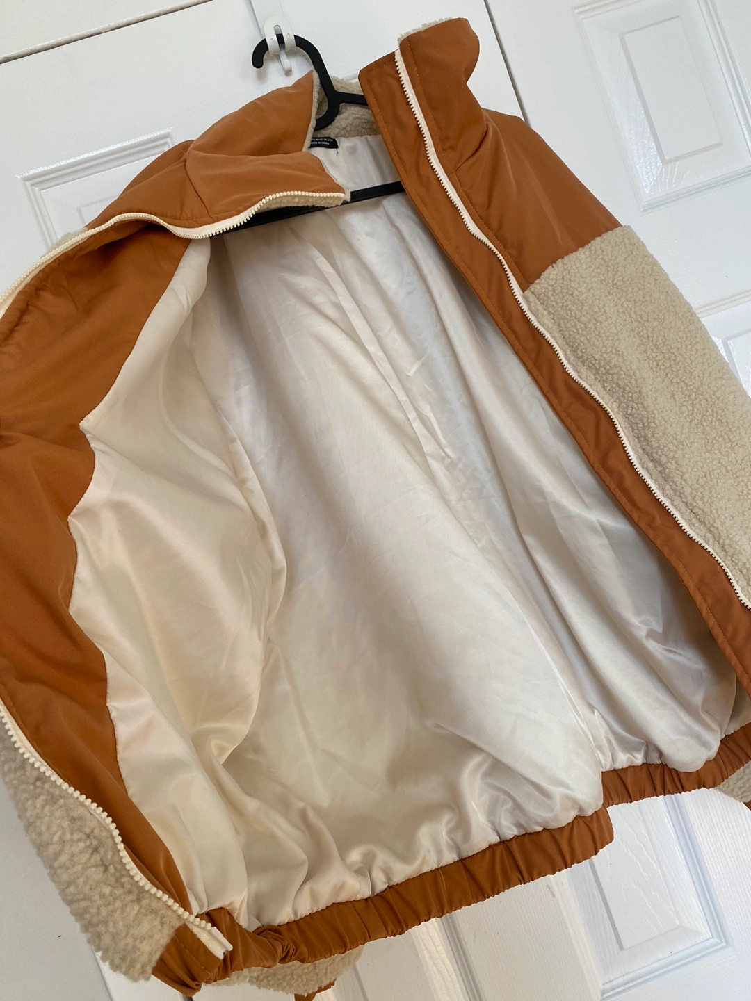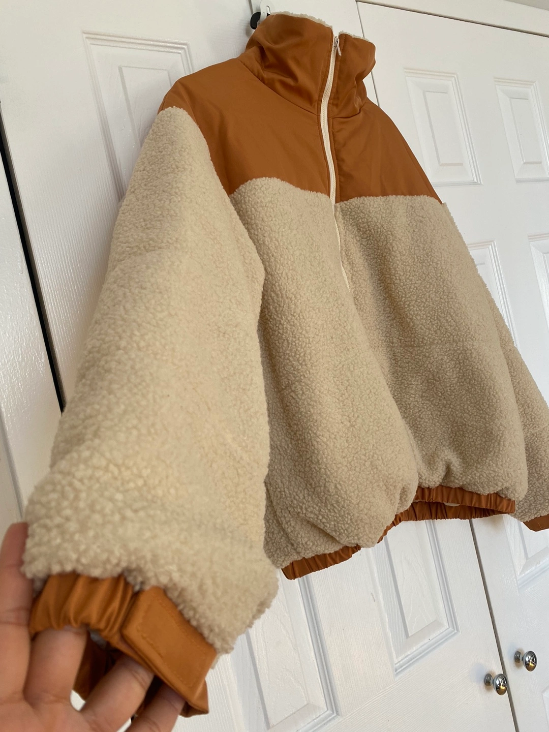 Brown and cream color block jacket. Features a zipper closure and a high neck.