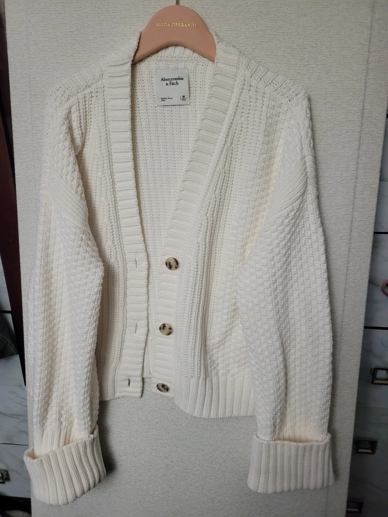 White cardigan with button closure. Knit fabric with ribbed detailing. Rolled cuffs.