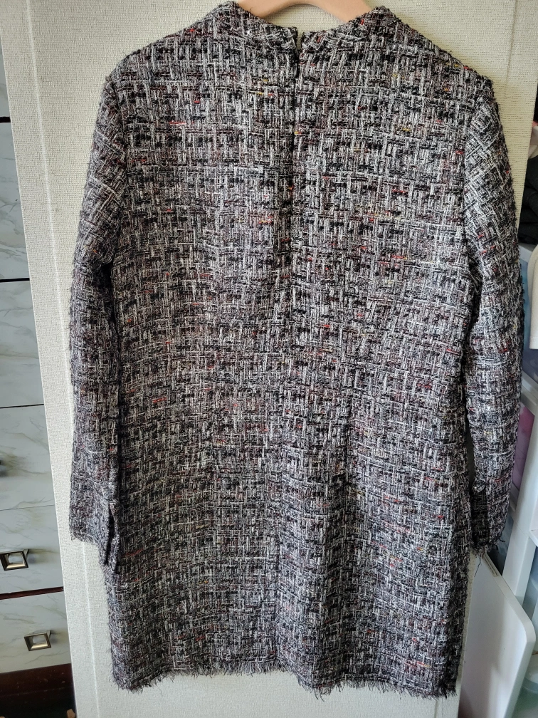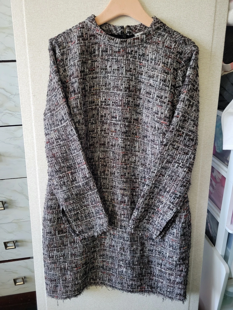 Long sleeve, black and white tweed dress with a high neckline and pockets. Dress has a black zipper up the back.