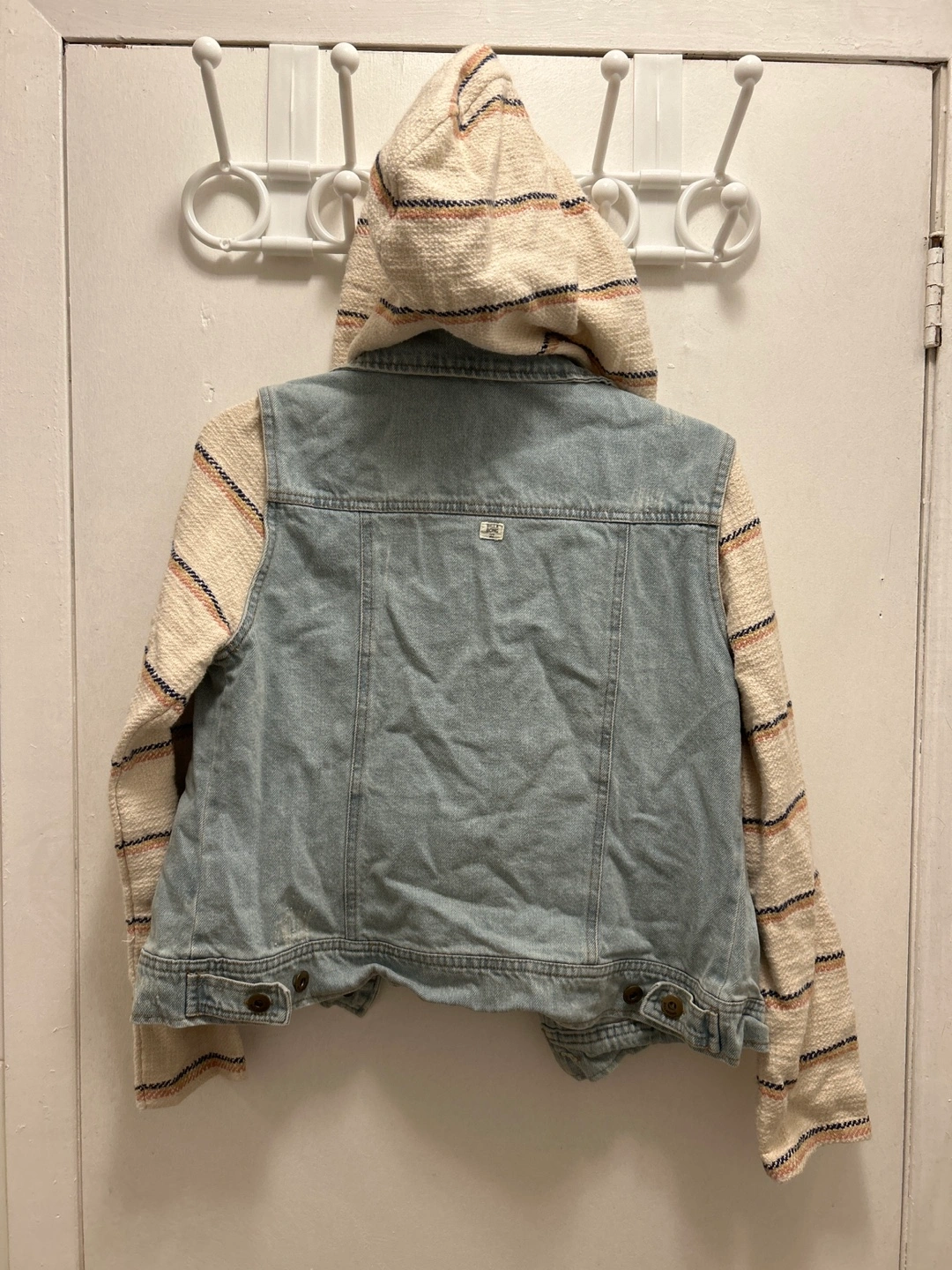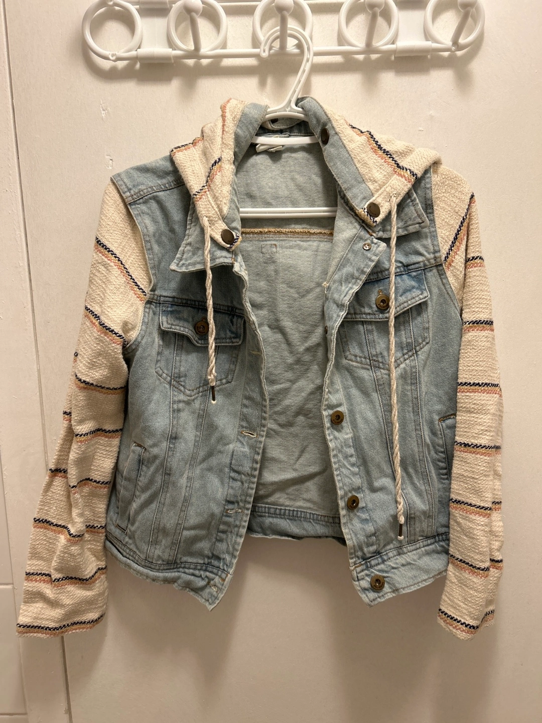 Light wash denim jacket with striped sleeves and hood. Button closure. Two front pockets.
