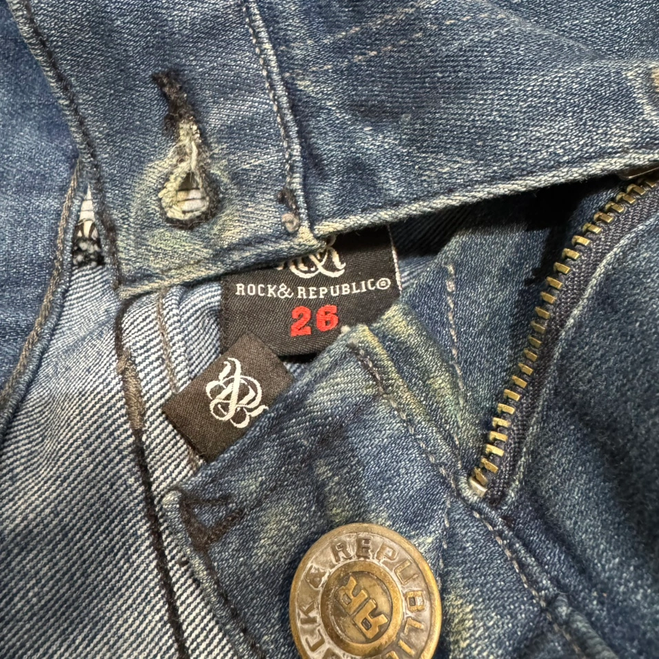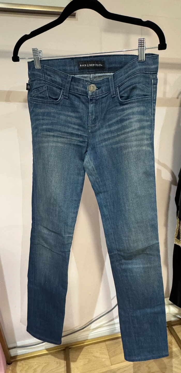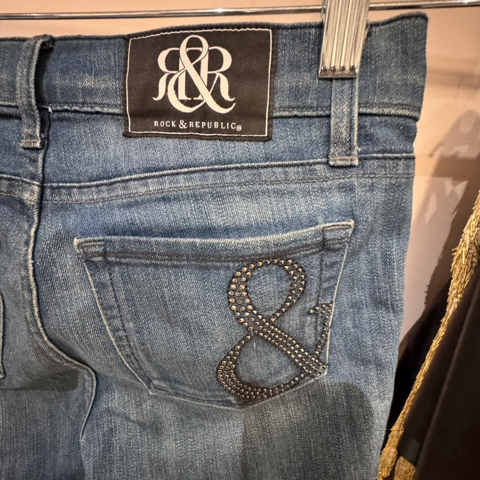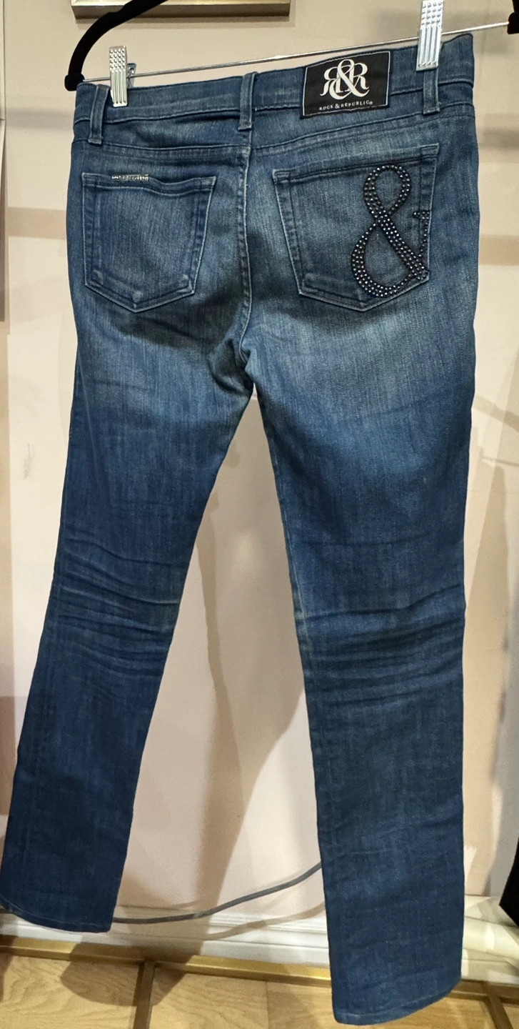 Dark wash denim jeans with a rhinestone embellishment on the back pocket. Size 26.