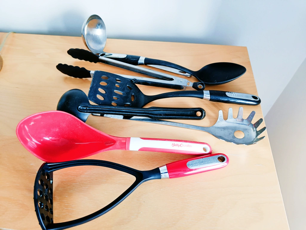 Set of 8 kitchen utensils. Includes: two ladles, a masher, a slotted spoon, a spatula, a set of tongs, and a spaghetti server. excellent condition. pick up only. check out my other listings for discounts!