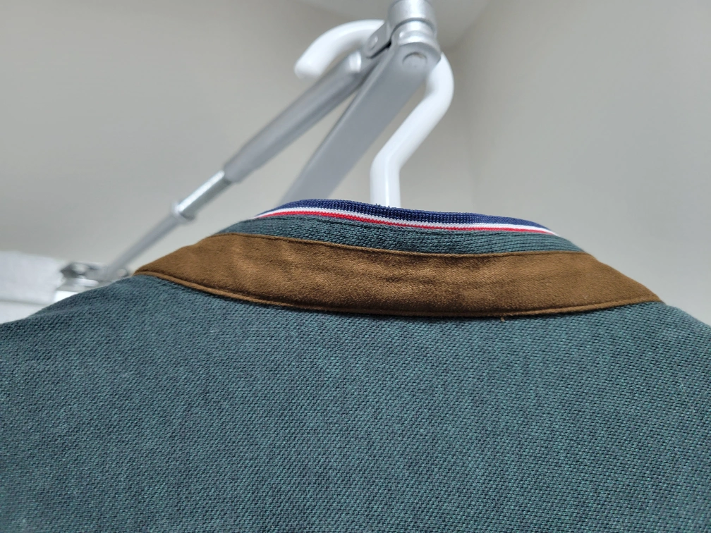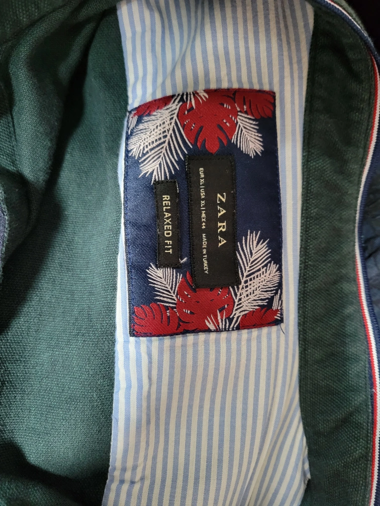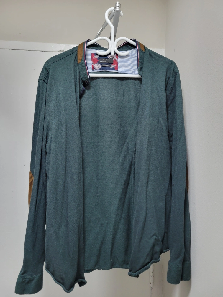 Long sleeve shirt with brown elbow patches and blue and white striped detail inside the cuff. Cash only Pick up only