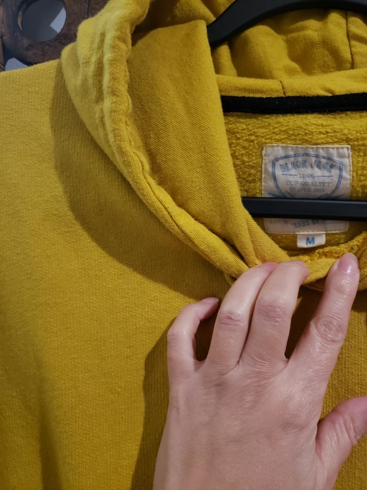 Black Jack mustard yellow hoodie with black and white stripes on the shoulders, sleeves and bottom hem.