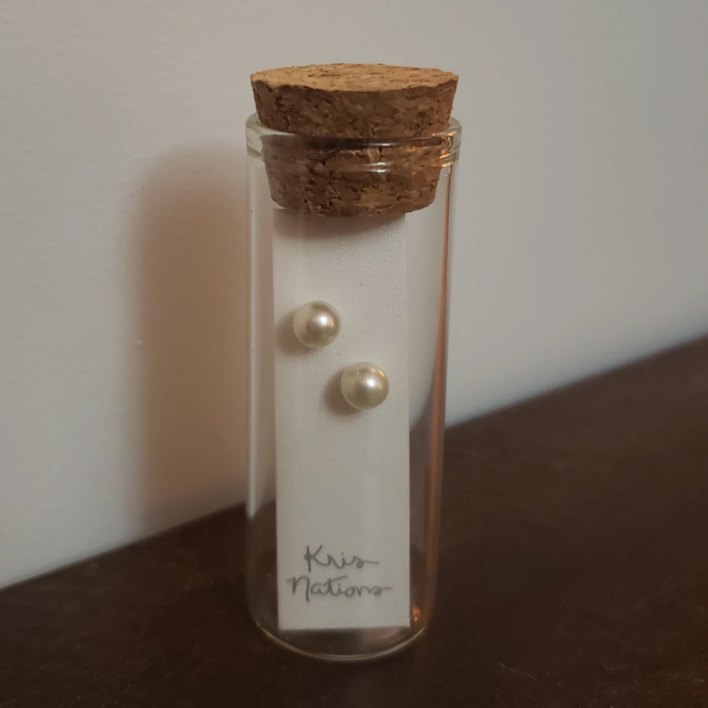Kris Nations pearl stud earrings. White faux pearls with silver posts. Packaged in a glass vial.