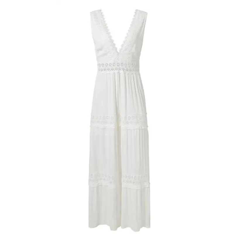 White Resort style maxi dress with a deep V-neck . Features lace detailing and a tiered skirt. Size : S