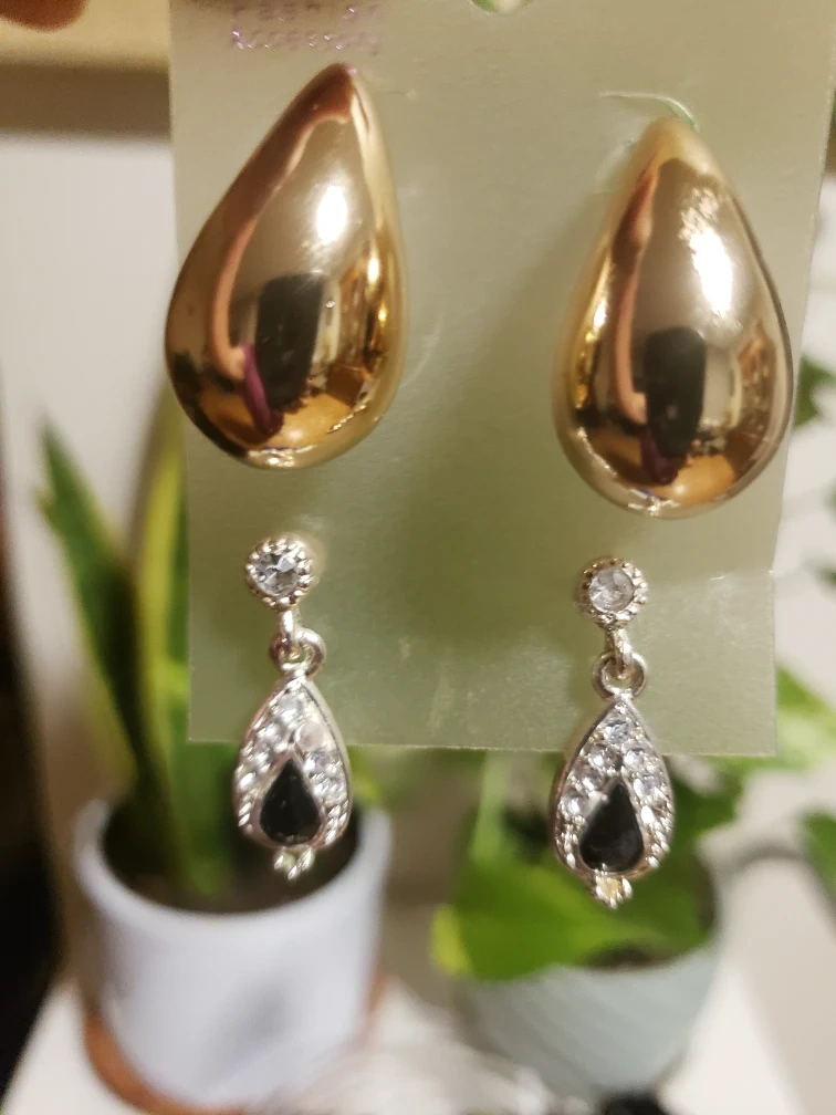 Gold tone teardrop earrings with black and white rhinestones. The set includes two pairs of earrings.